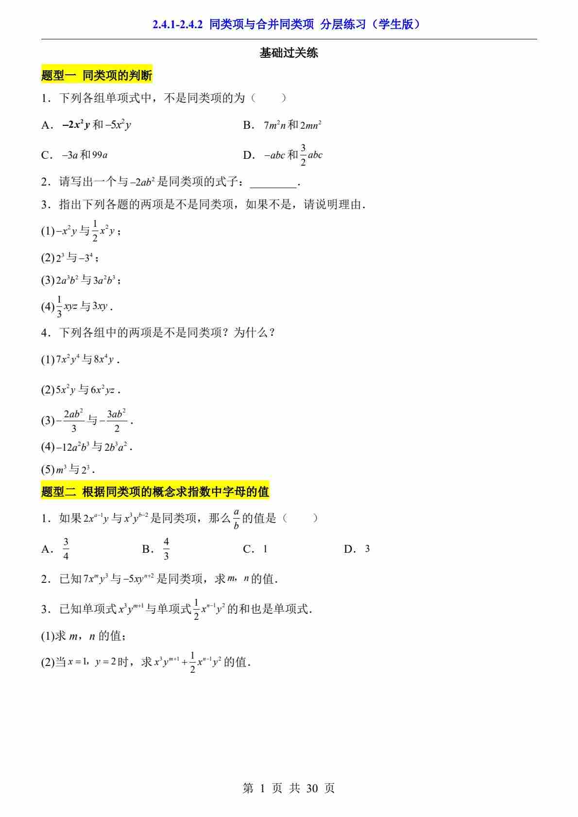 2.4.1-2.4.2 同类项与合并同类项(分层练习)