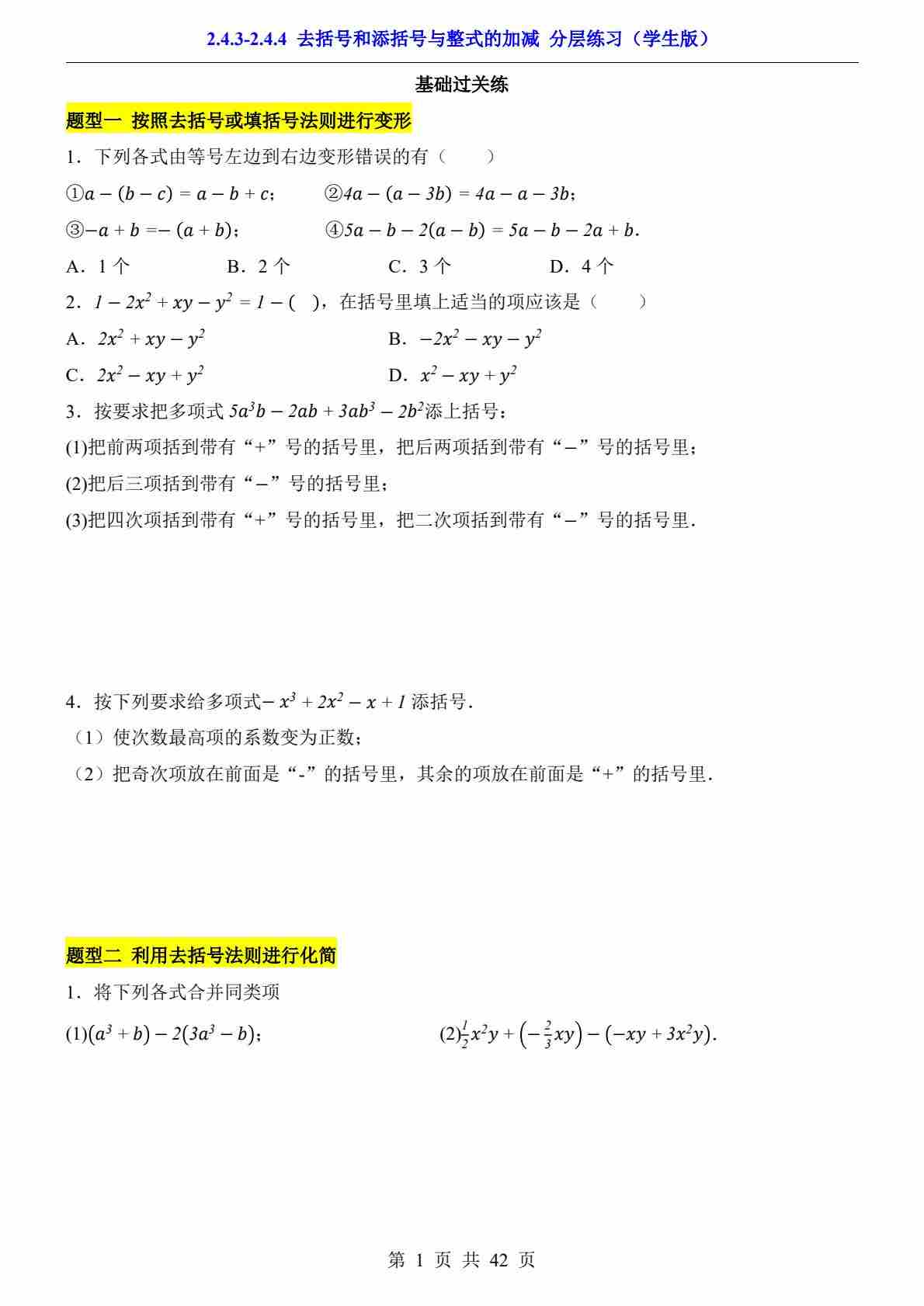 2.4.3-2.4.4 去括号和添括号与整式的加减(分层练习)