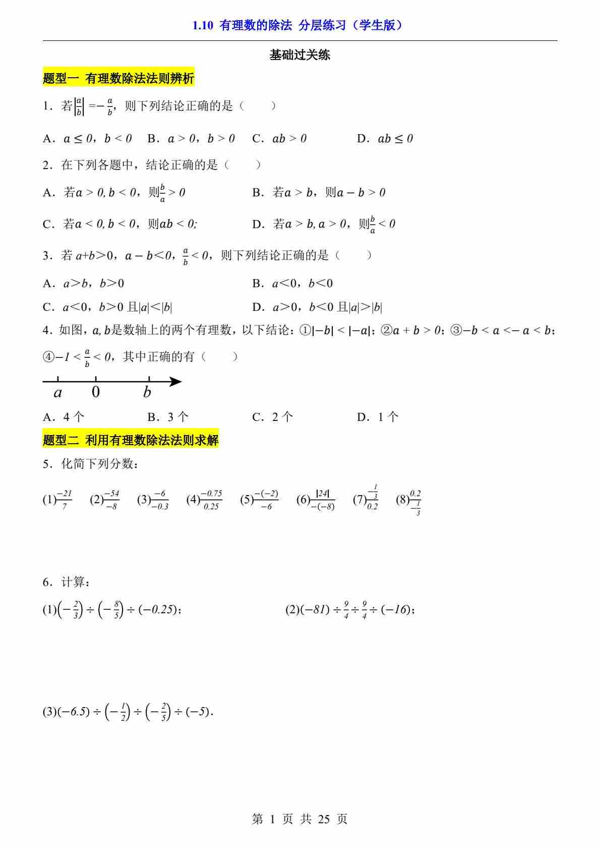 1.10 有理数的除法(分层练习)