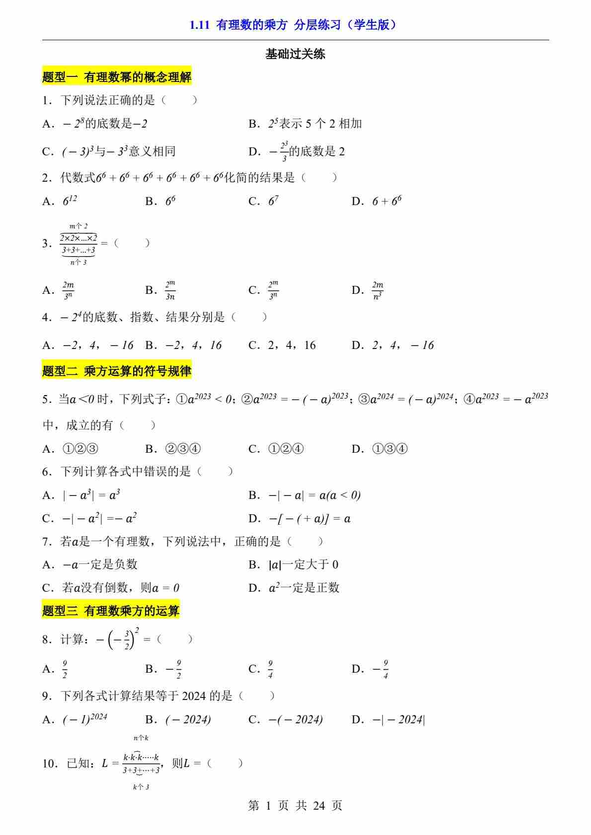 1.11 有理数的乘方(分层练习)