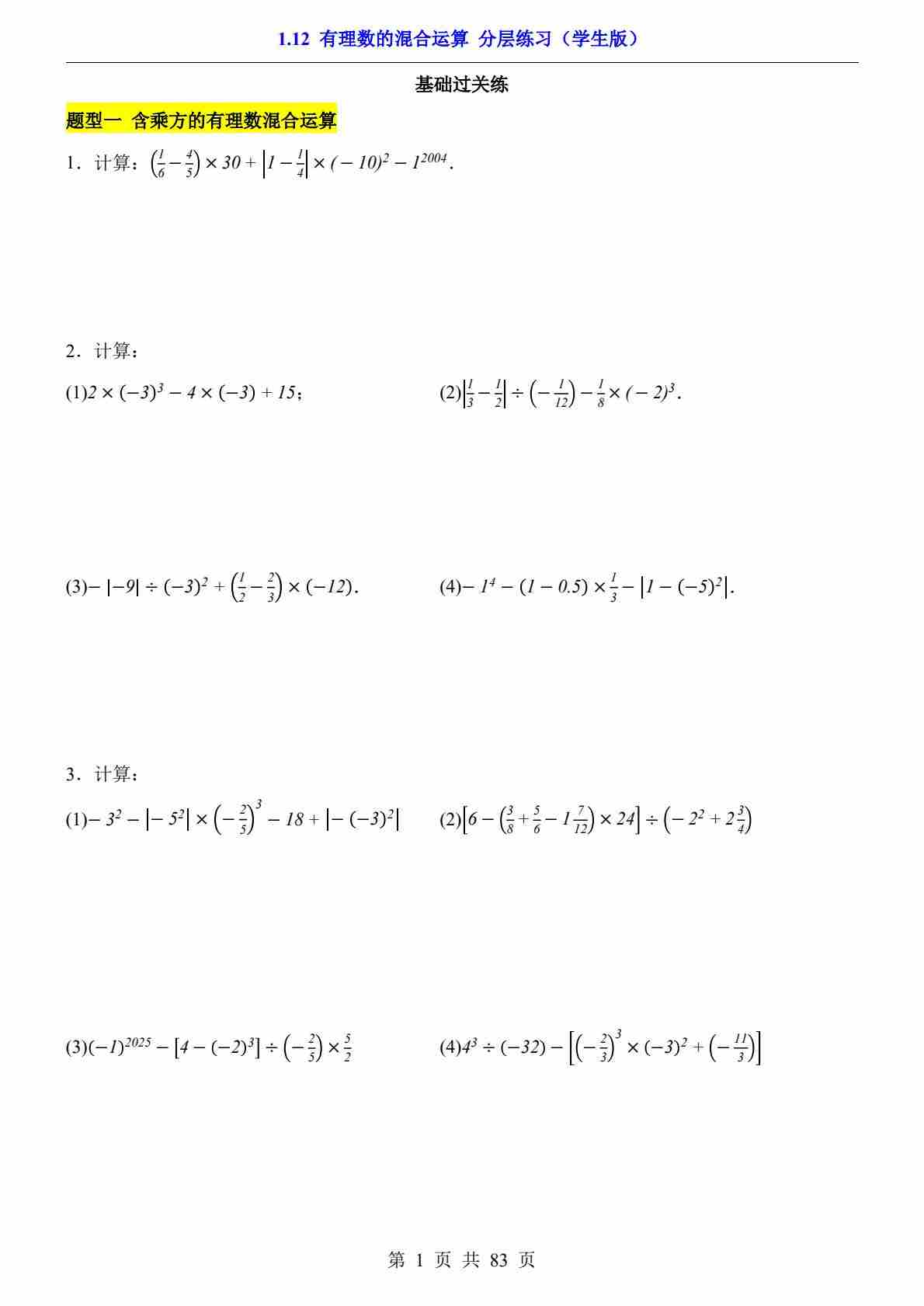 1.12 有理数的混合运算(分层练习)