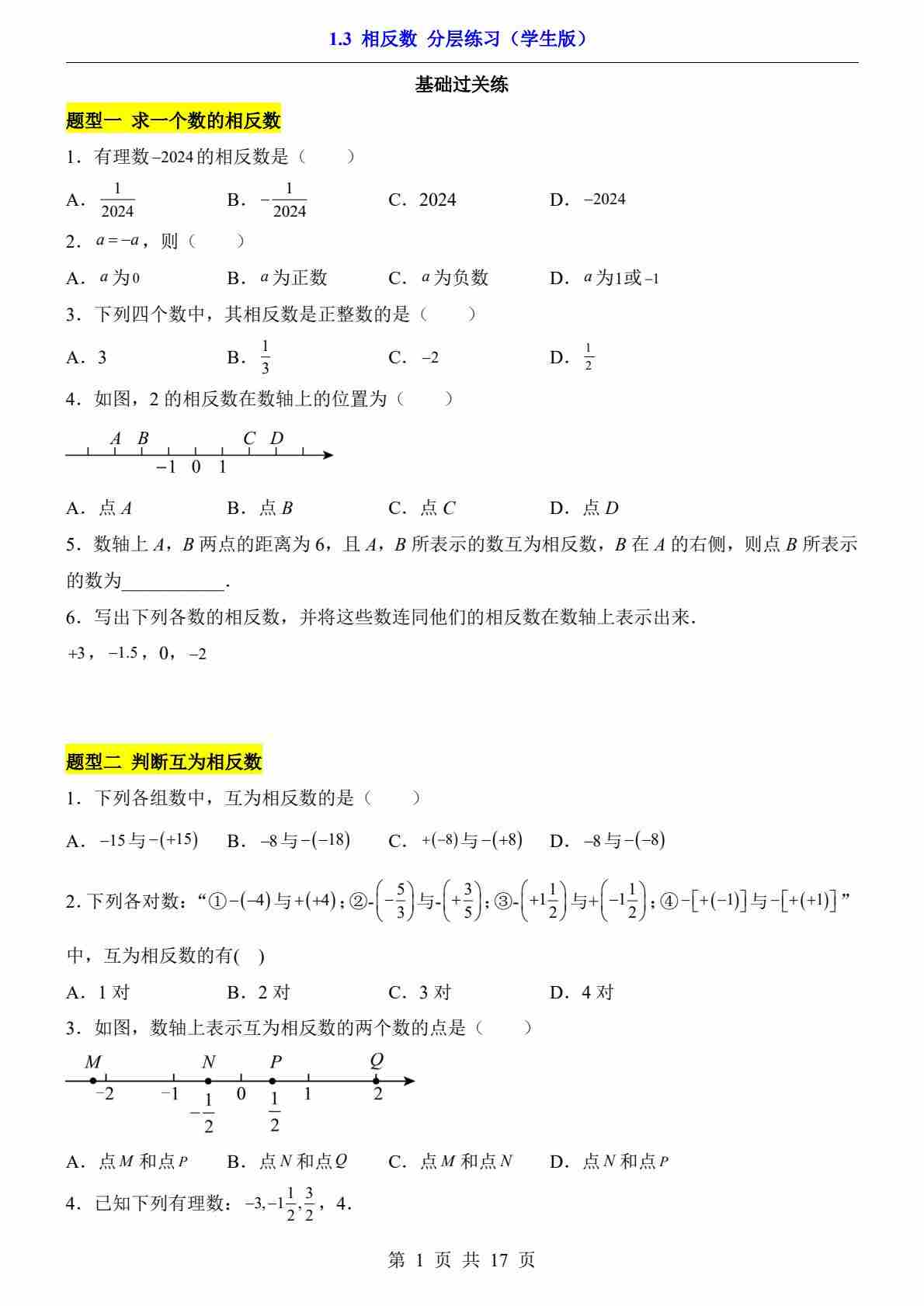 1.3 相反数(分层练习)