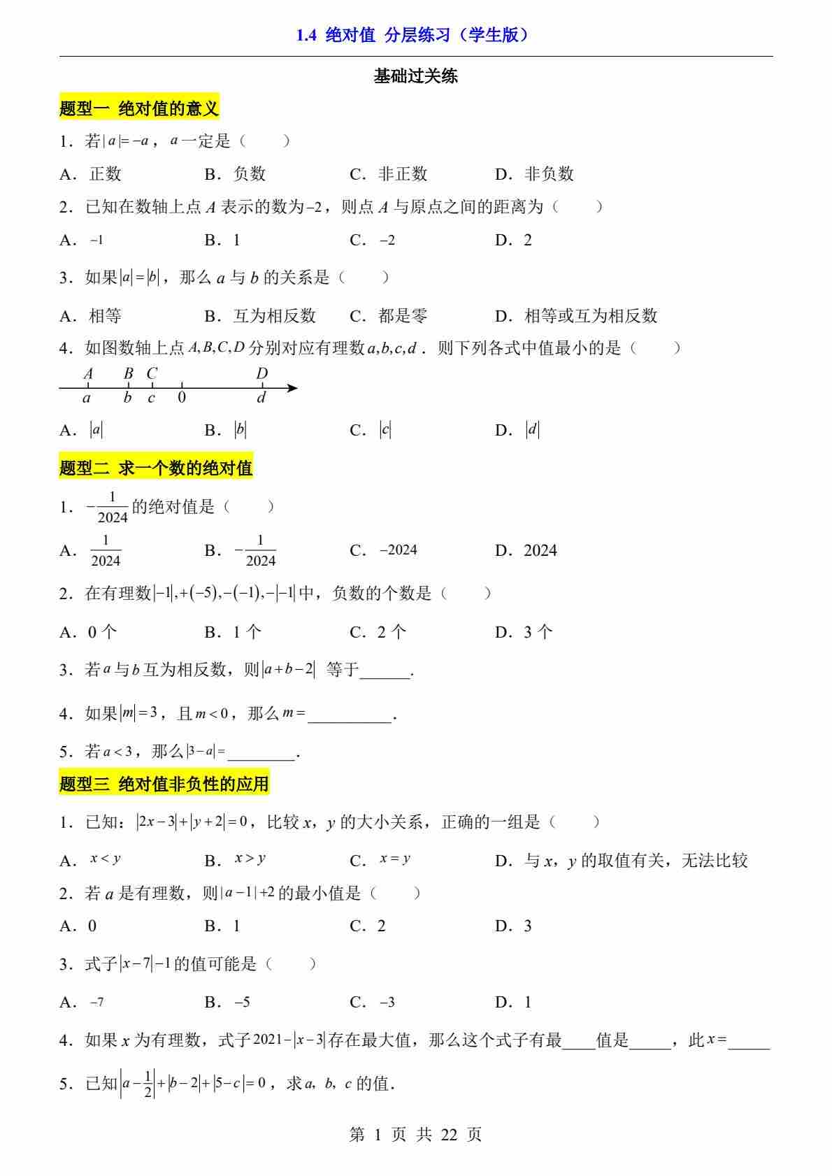 1.4 绝对值(分层练习)