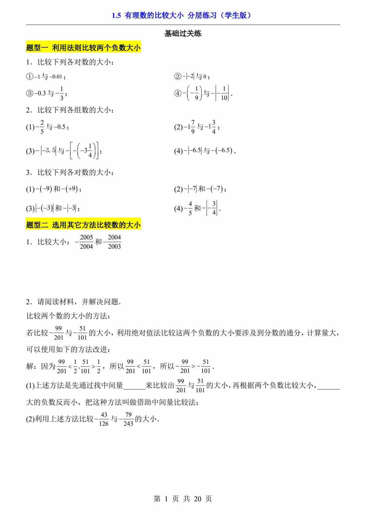1.5 有理数的比较大小(分层练习)