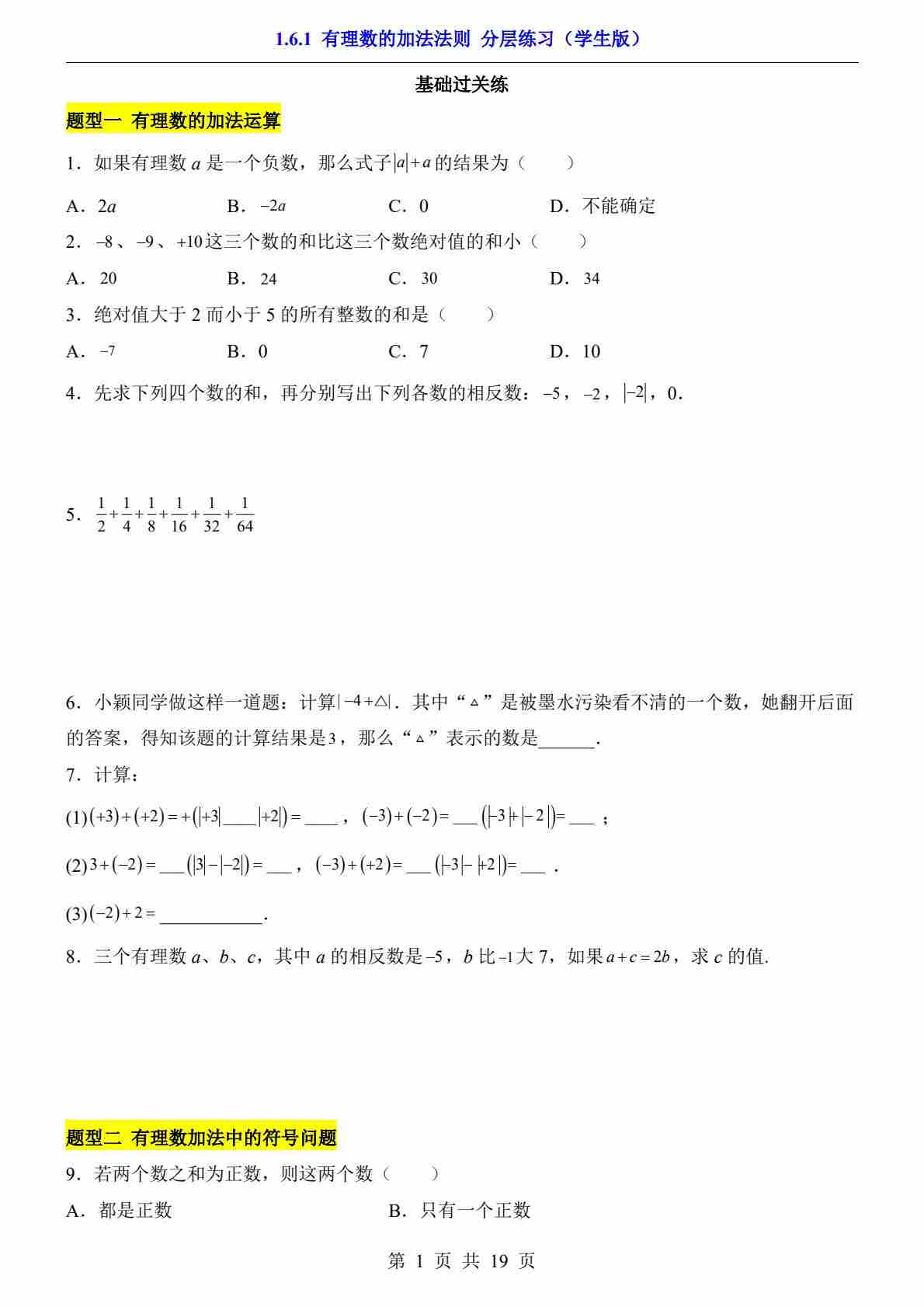1.6.1 有理数的加法法则(分层练习)