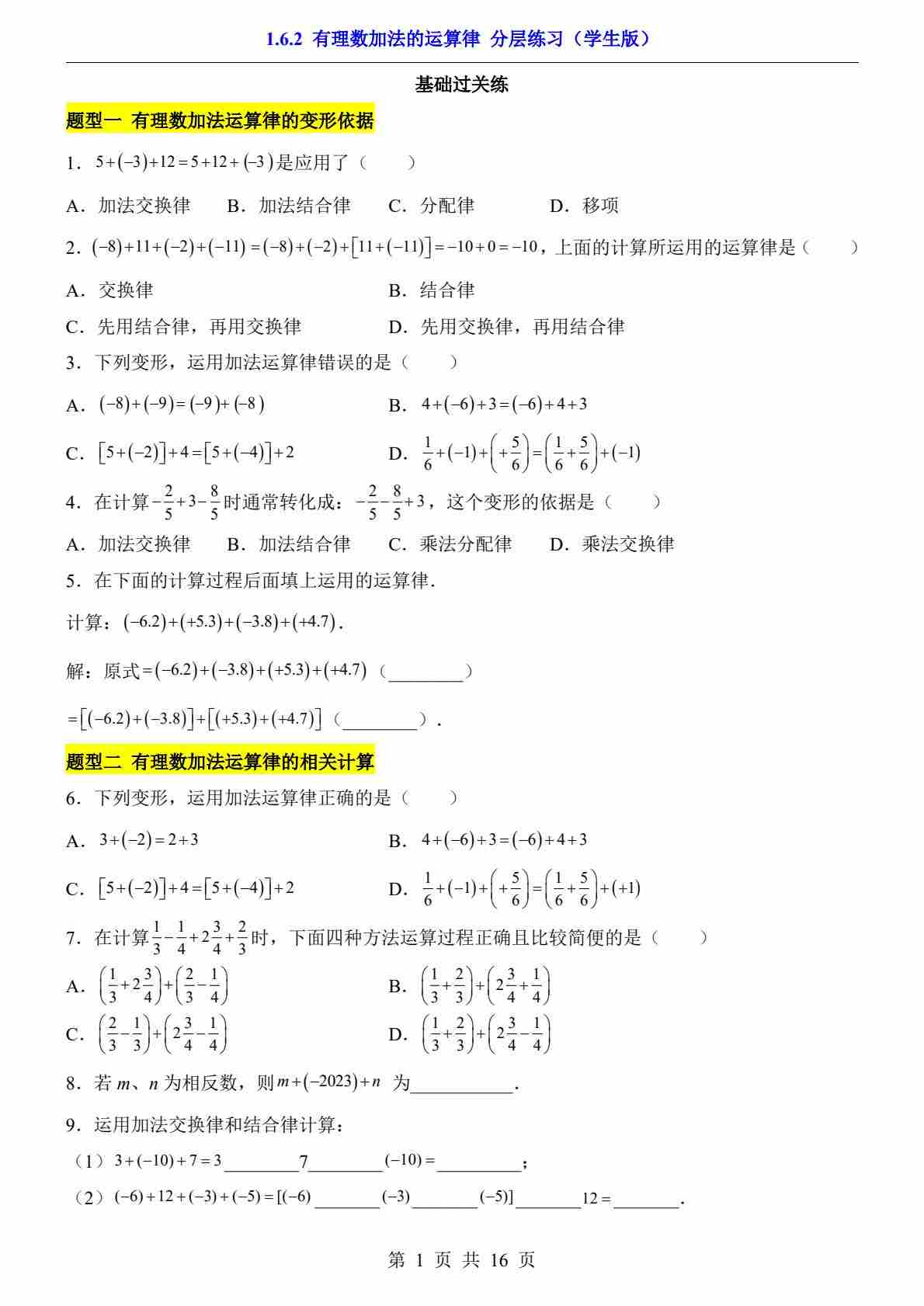 1.6.2 有理数加法的运算律(分层练习)