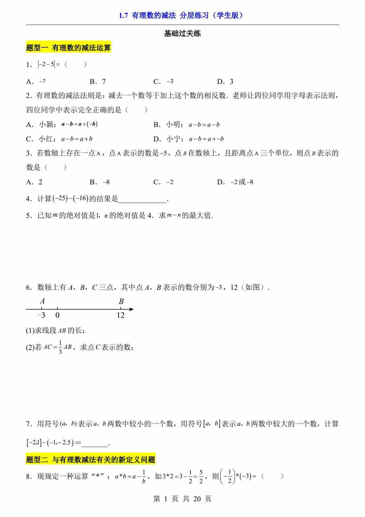 1.7 有理数的减法(分层练习)