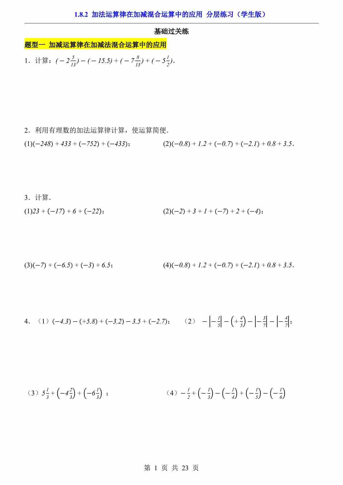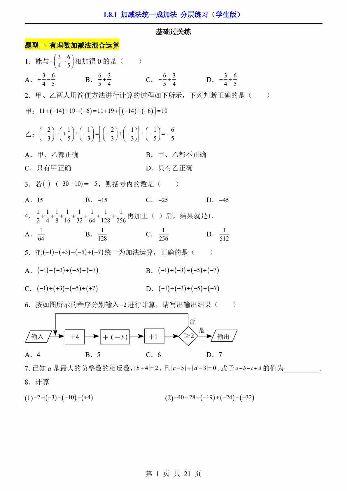 1.8.1 加减法统一成加法(分层练习)