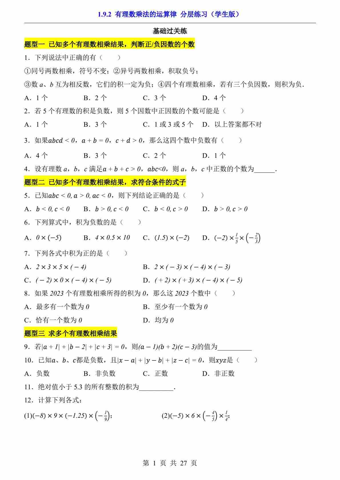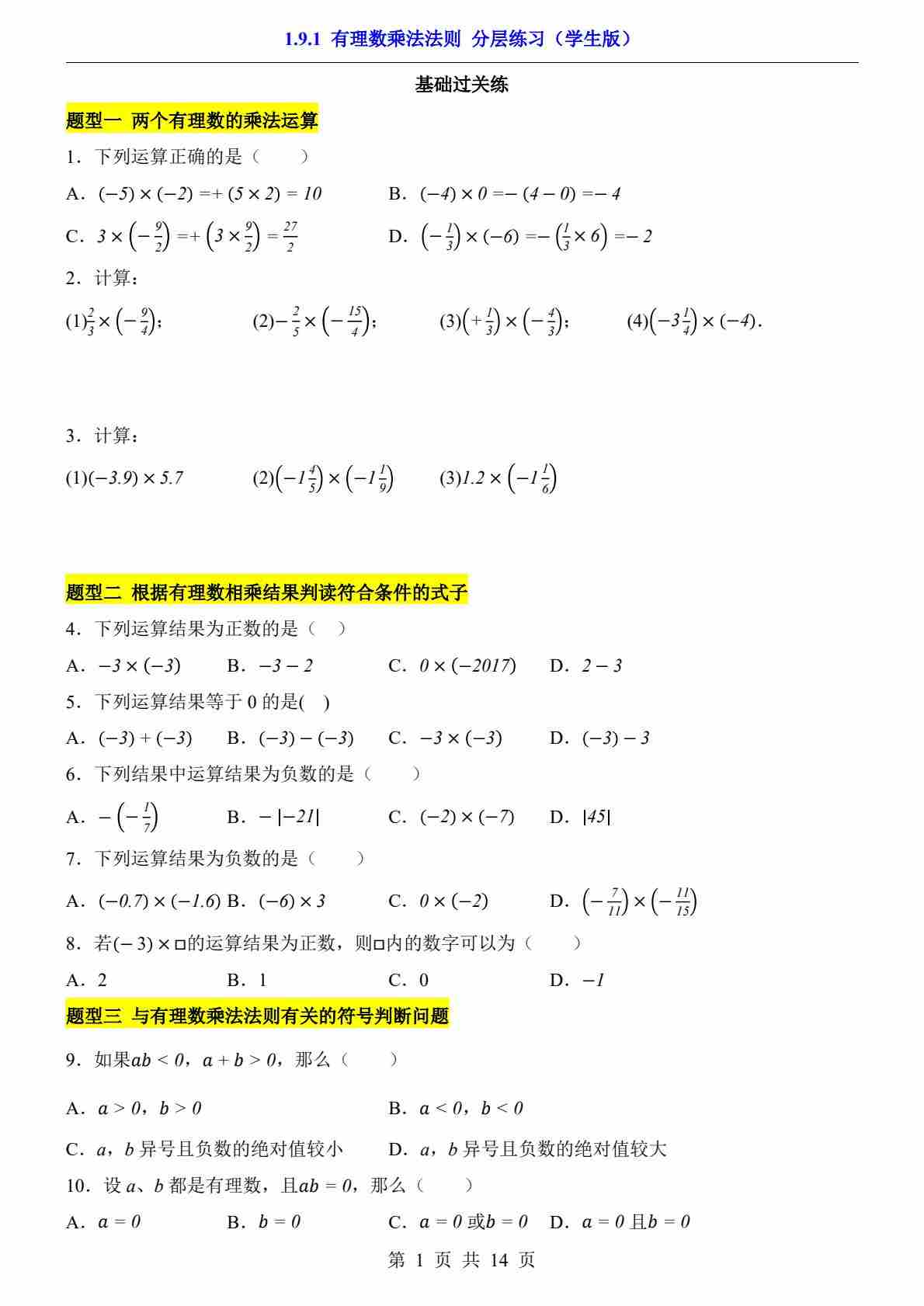 1.9.1 有理数乘法法则(分层练习)