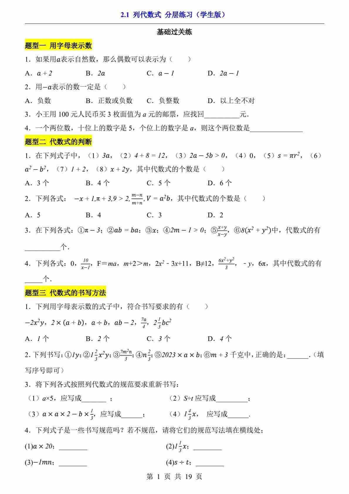 2.1 列代数式(分层练习)