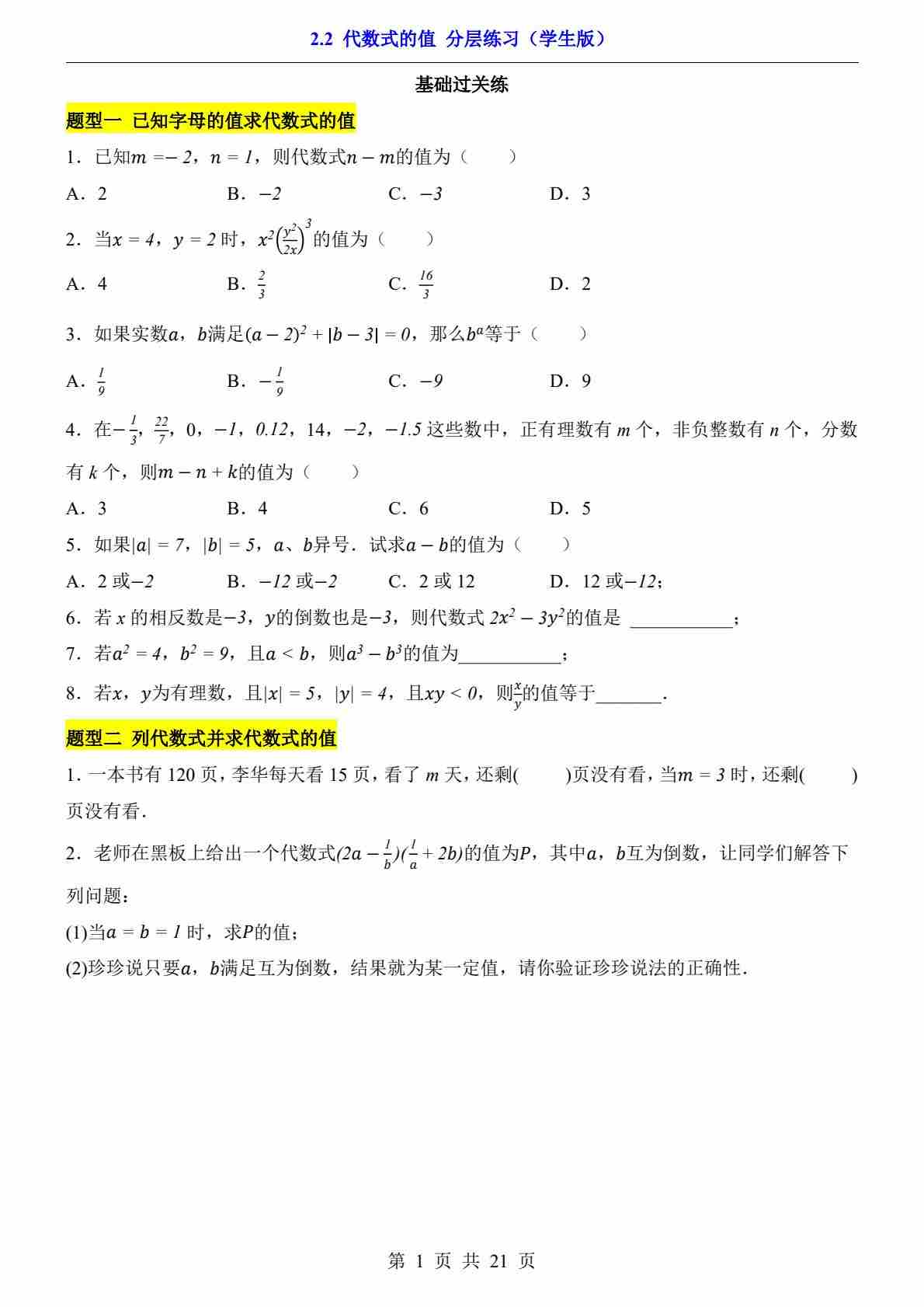 2.2 代数式的值(分层练习)