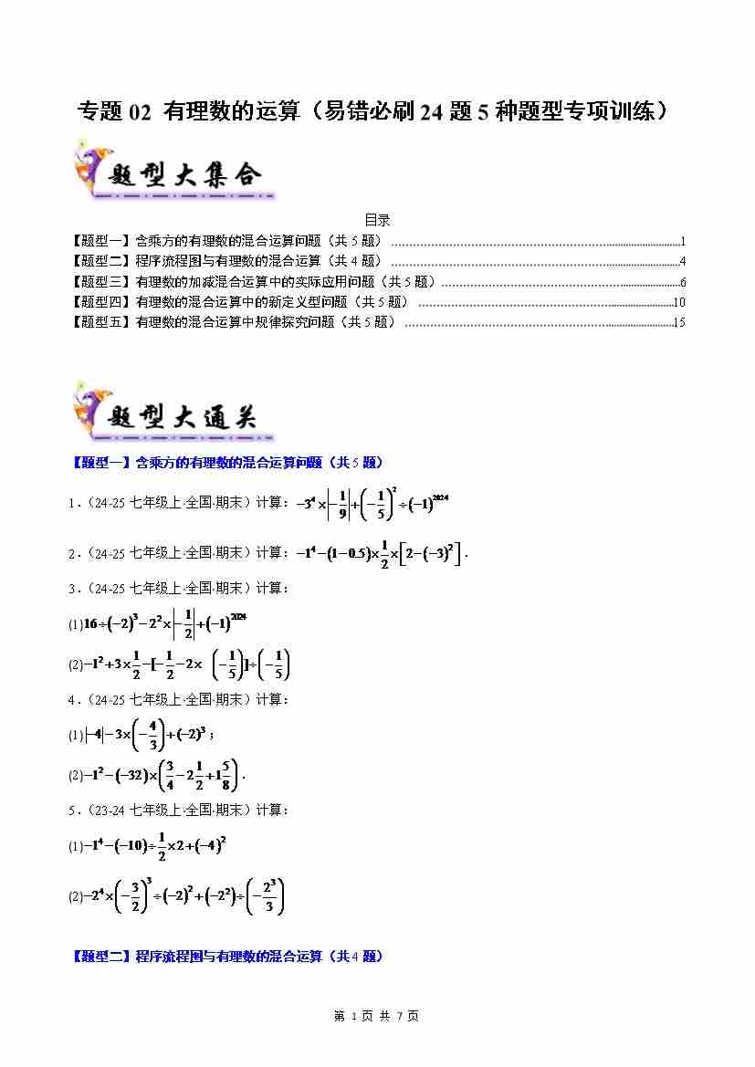 专题02 有理数的运算(考题猜想,易错必刷24题5种题型)(原卷版)