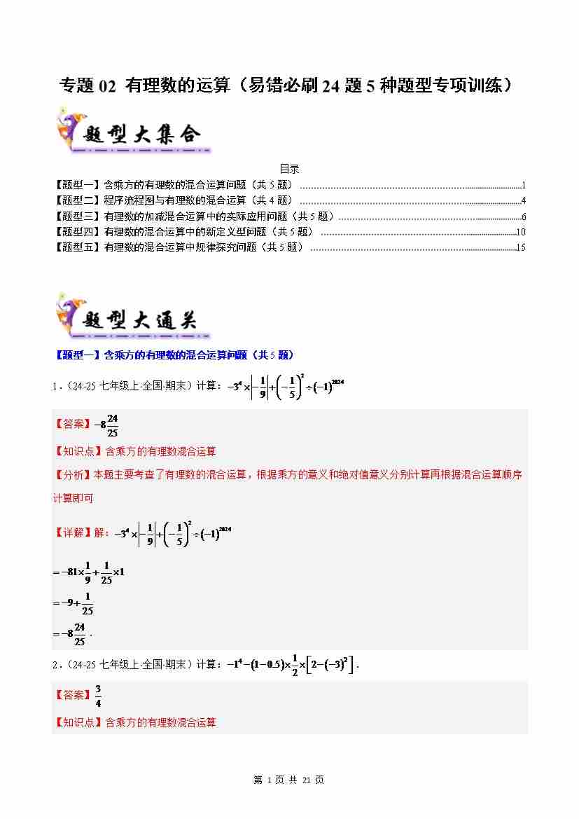 专题02 有理数的运算(考题猜想,易错必刷24题5种题型)(解析版)