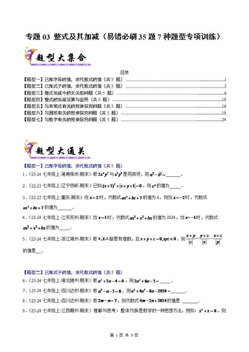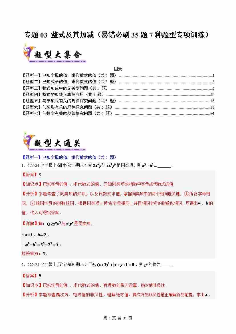 专题03 整式及其加减(考题猜想,易错必刷35题6种题型)(解析版)