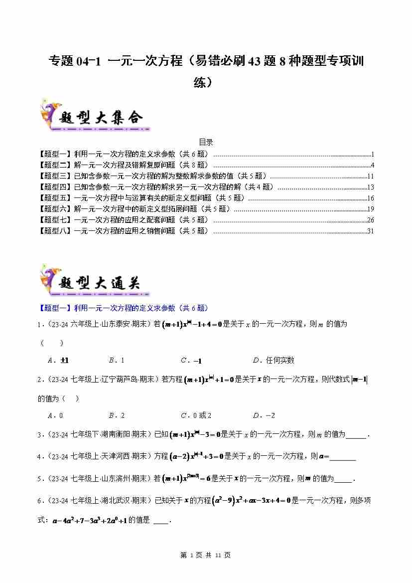 专题04-1 一元一次方程(考题猜想,易错必刷43题8种题型)(原卷版)