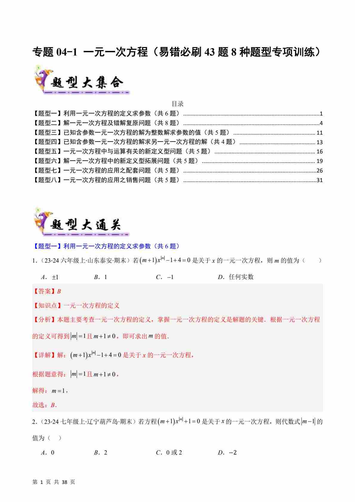 专题04-1 一元一次方程(考题猜想,易错必刷43题8种题型)(解析版)