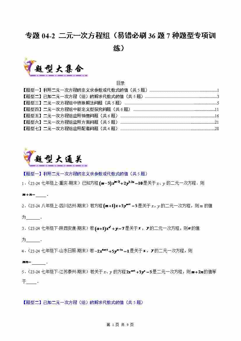 专题04-2 二元一次方程组(考题猜想,易错必刷36题7种题型)(原卷版)