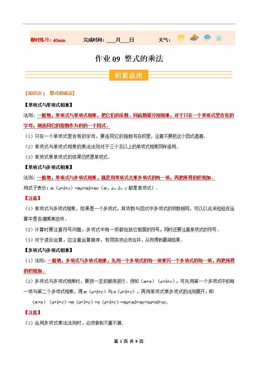 ③寒假培优练-专题09 整式的乘法(巩固培优)八年级数学新教材人教版(学生版)-2026年八年级数学寒假衔接讲练 (人教版-新教材)