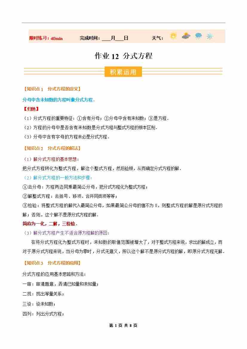 ③寒假培优练-专题12 分式方程(巩固培优)八年级数学新教材人教版(学生版)-2026年八年级数学寒假衔接讲练 (人教版-新教材)