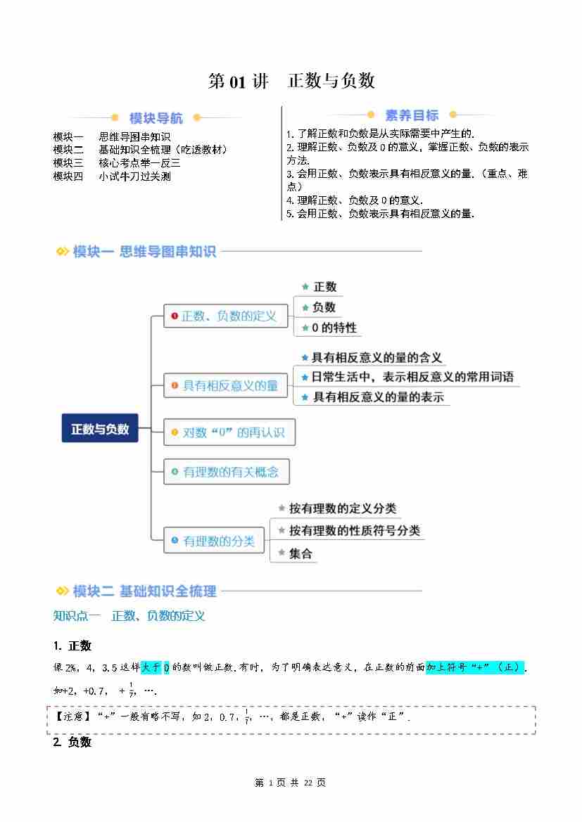 第01讲 正数与负数(原卷版)