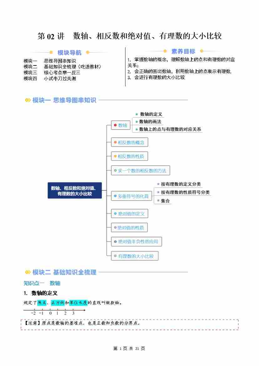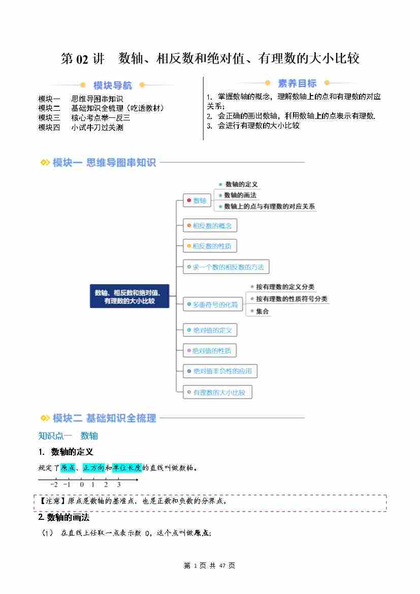 第02讲 数轴、相反数和绝对值、有理数的大小比较(原卷版)