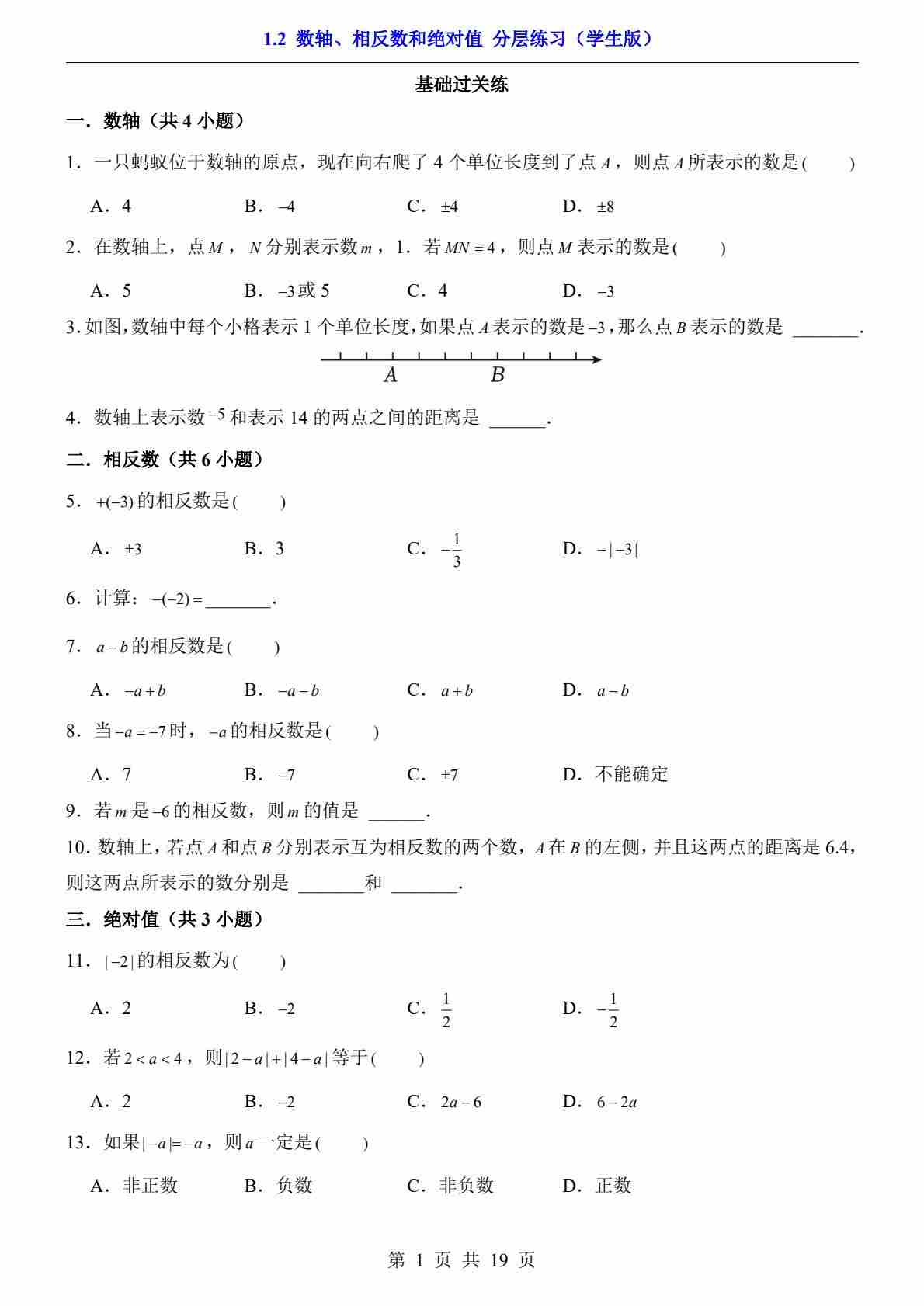 1.2 数轴、相反数和绝对值(分层练习)