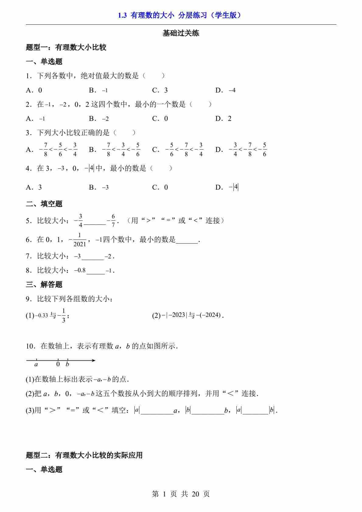 1.3 有理数的大小(分层练习)