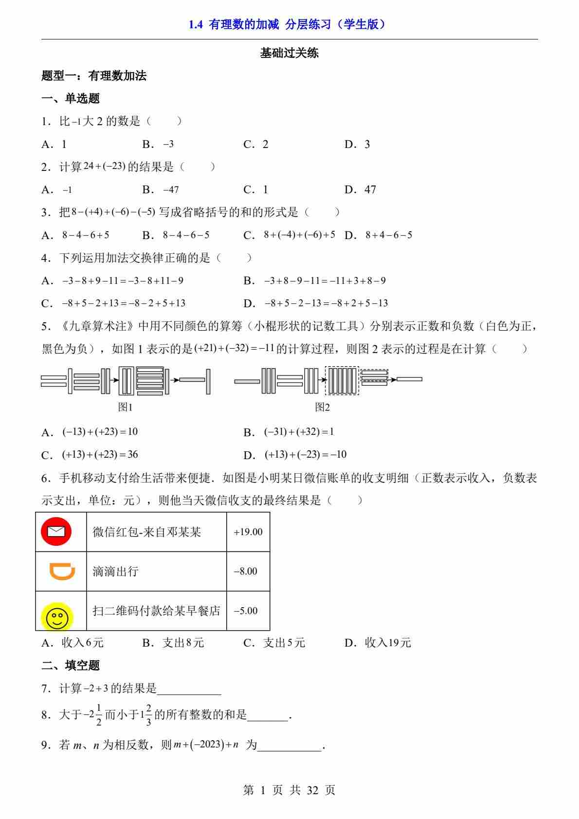 1.4 有理数的加减(分层练习)