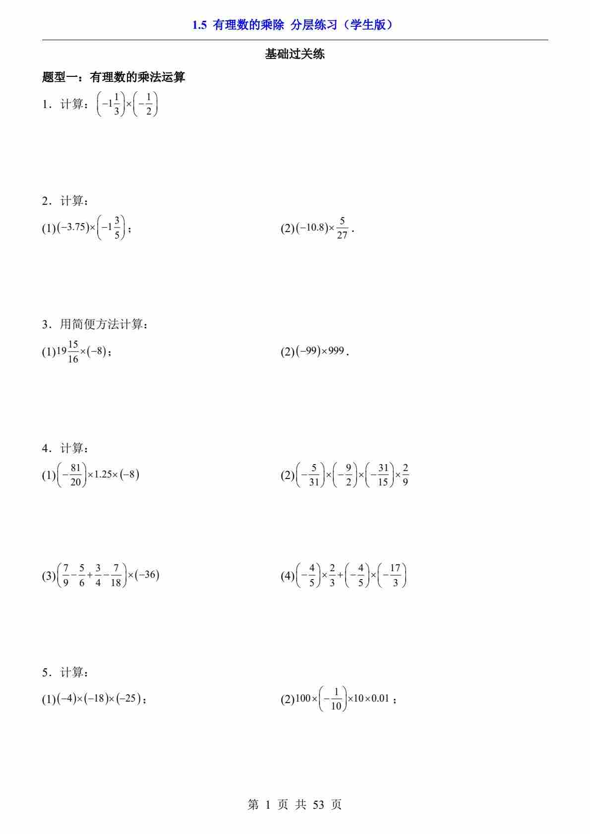 1.5 有理数的乘除(分层练习)