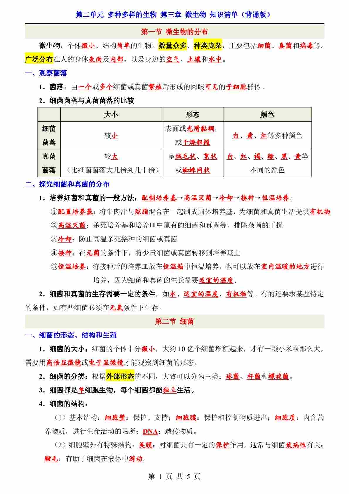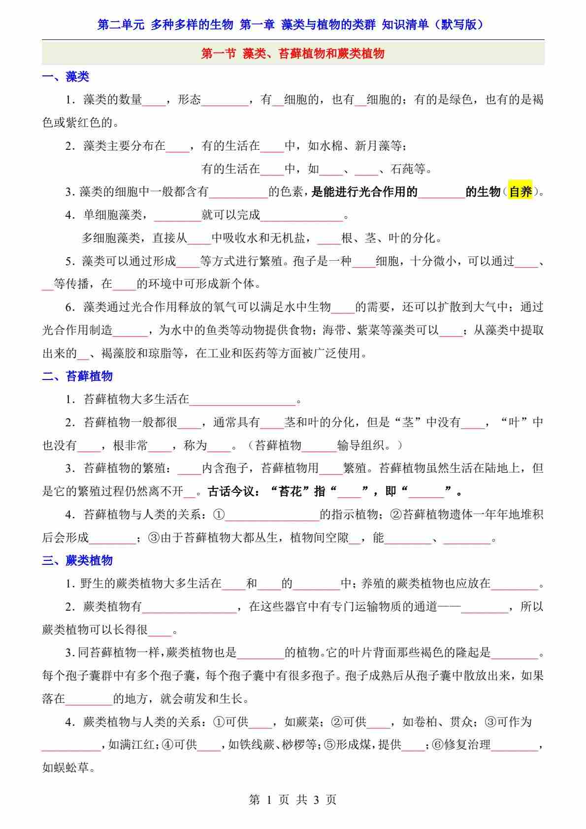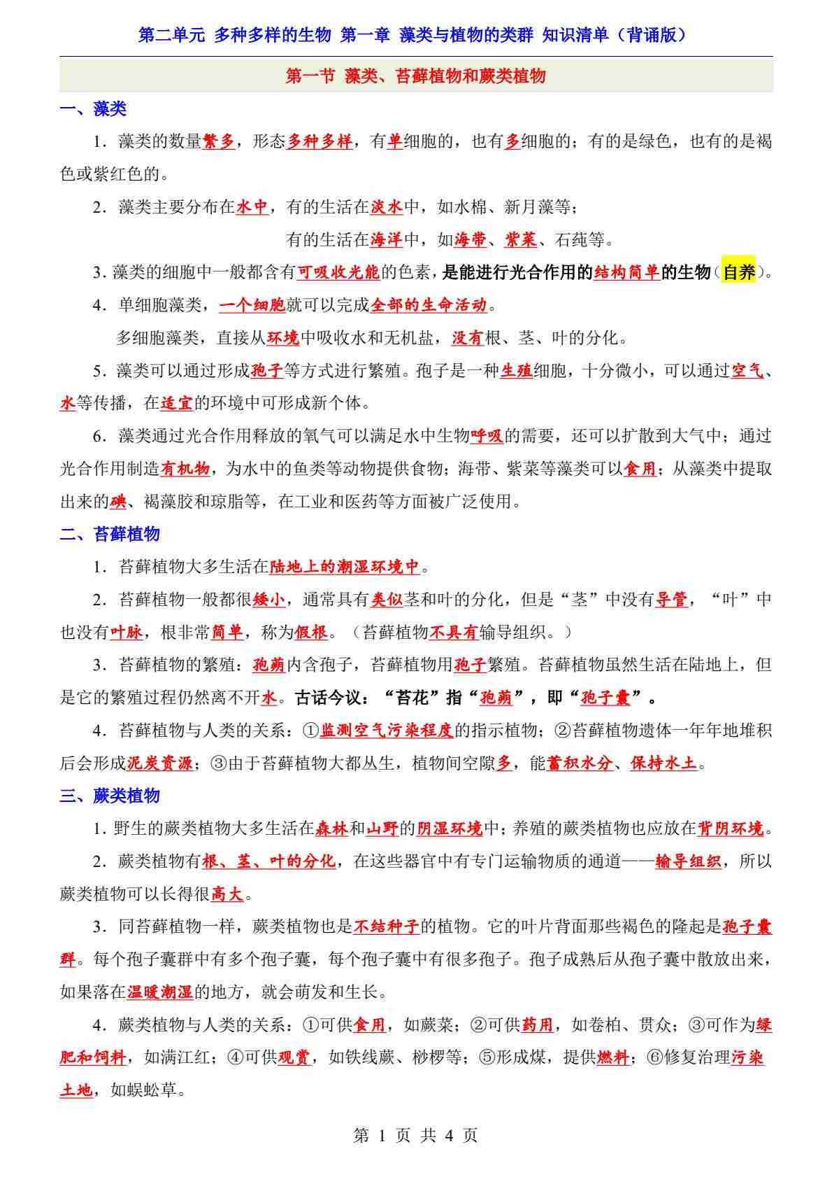 第2单元 第1章 藻类与植物的类群(知识清单-背诵版)