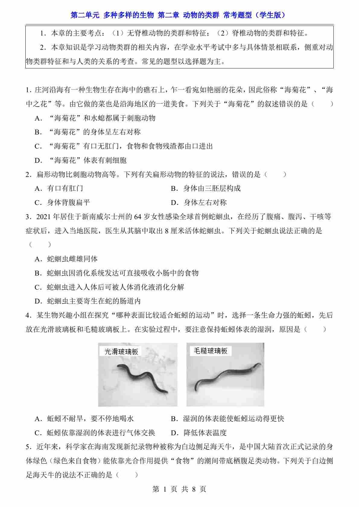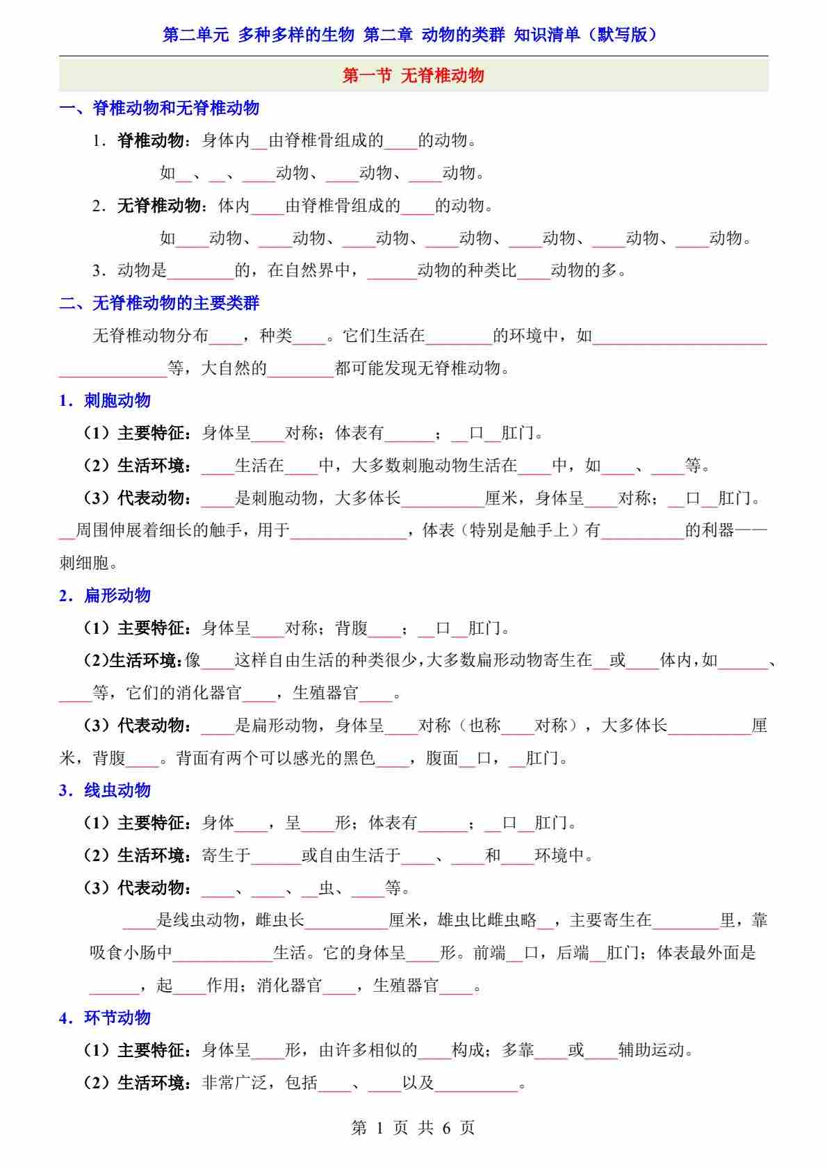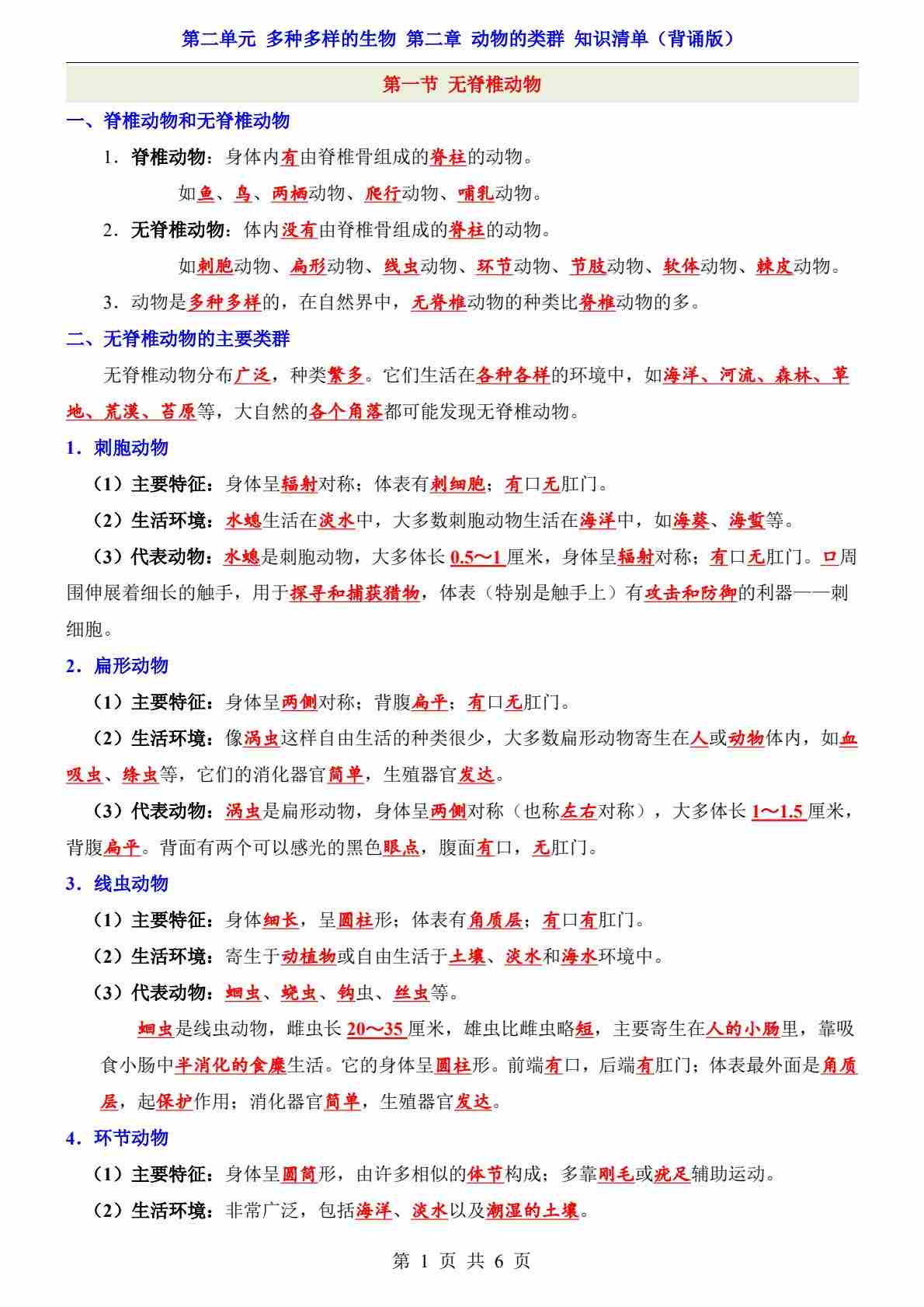 第2单元 第2章 动物的类群(知识清单-背诵版)