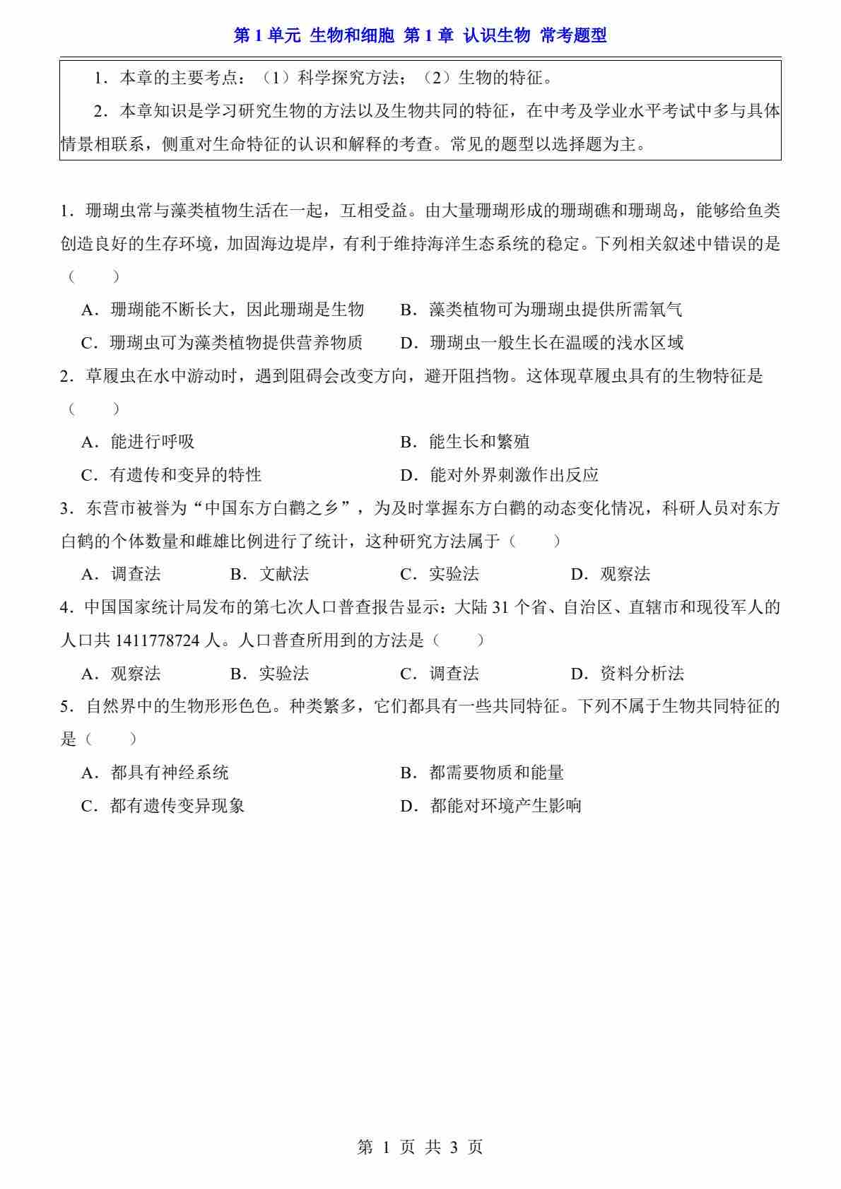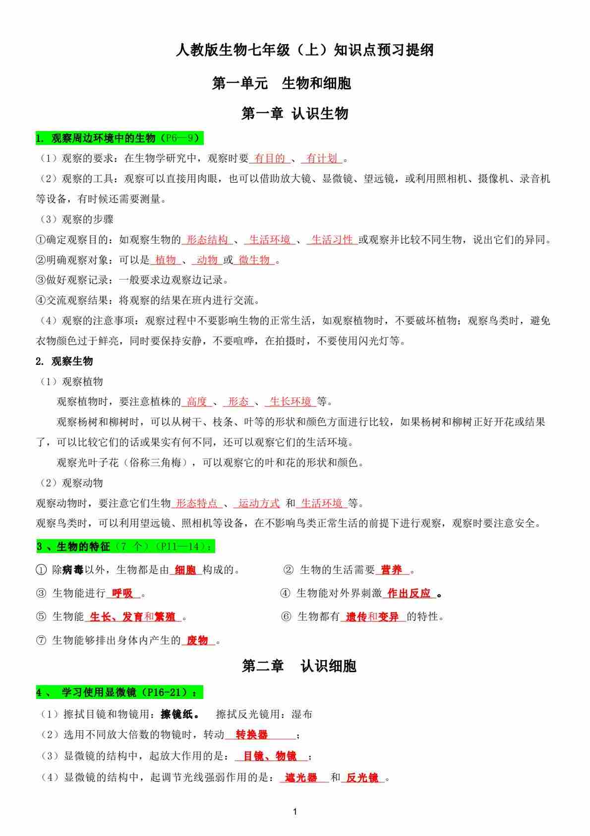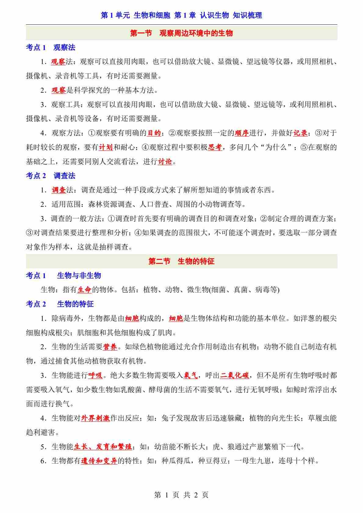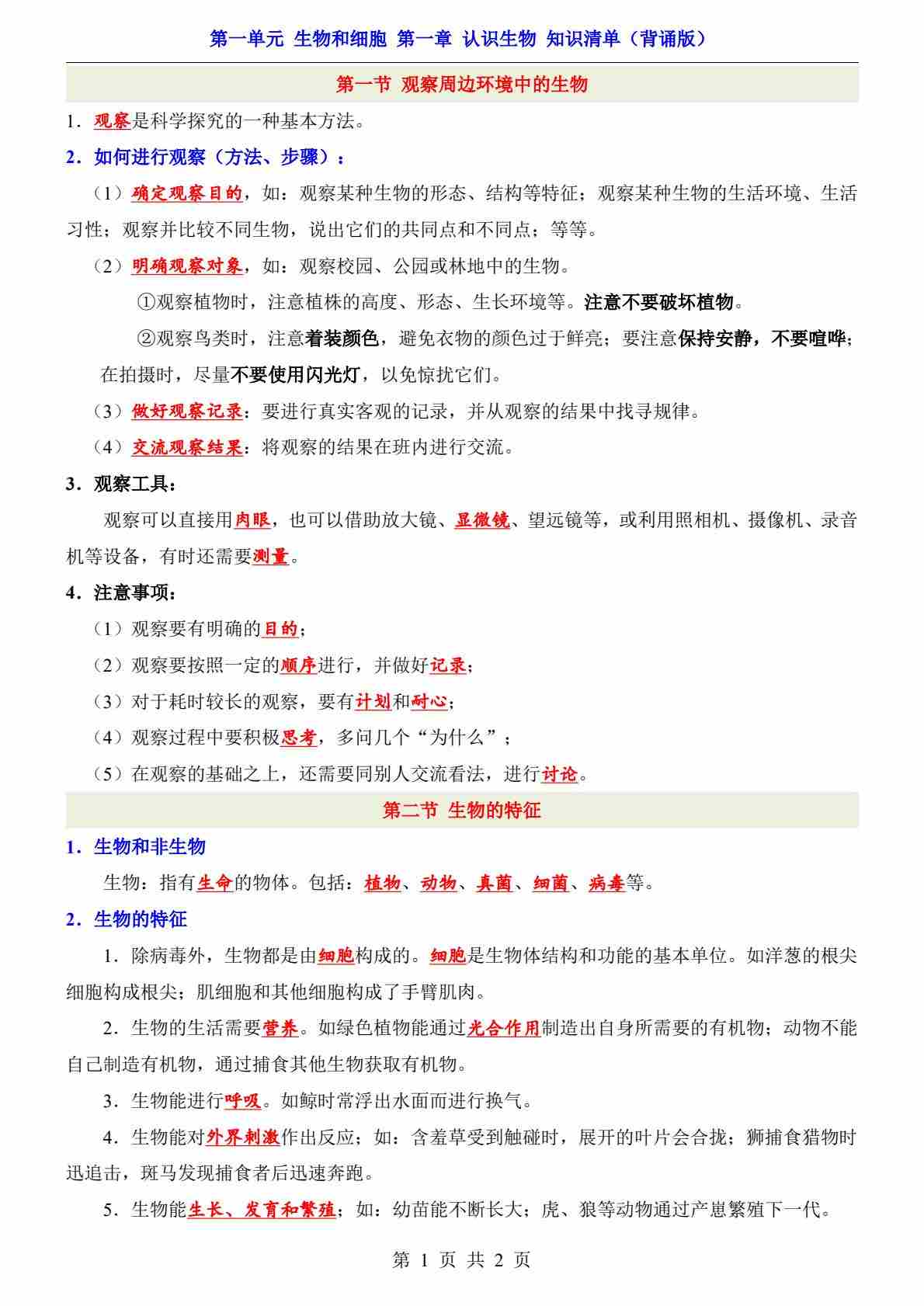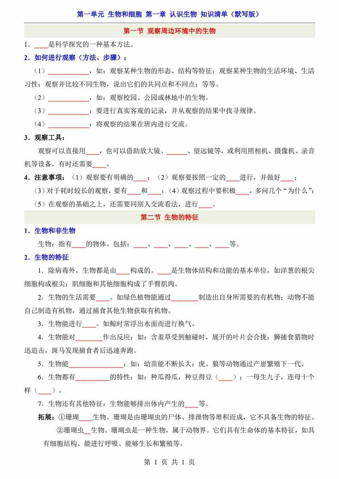 第1单元 第1章 认识生物(知识清单-背诵版)