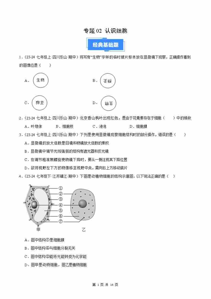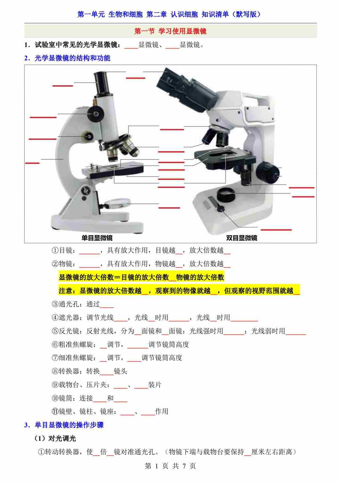 第1单元 第2章 认识细胞(知识清单-默写版)