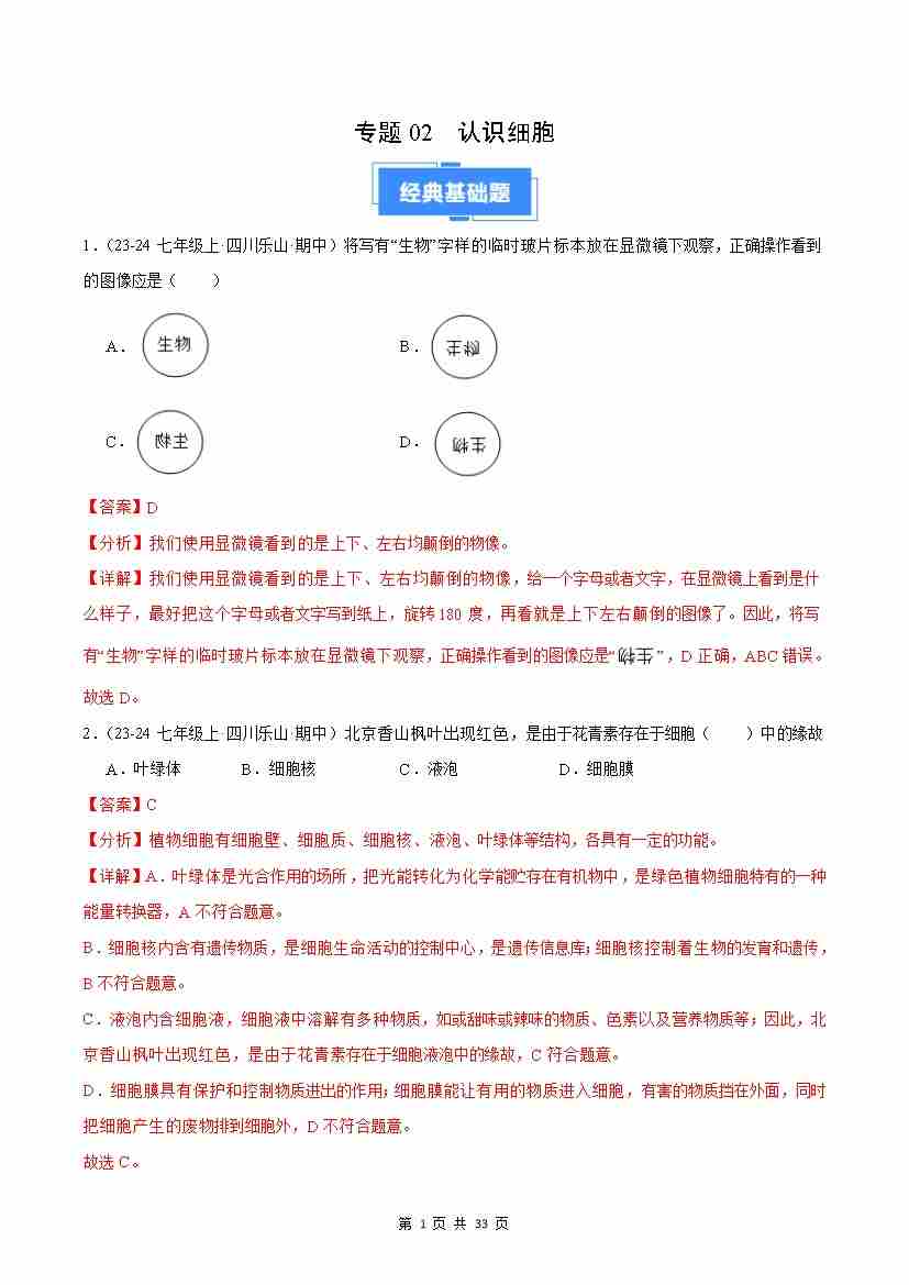 第1单元 第2章 认识细胞(知识清单-背诵版)