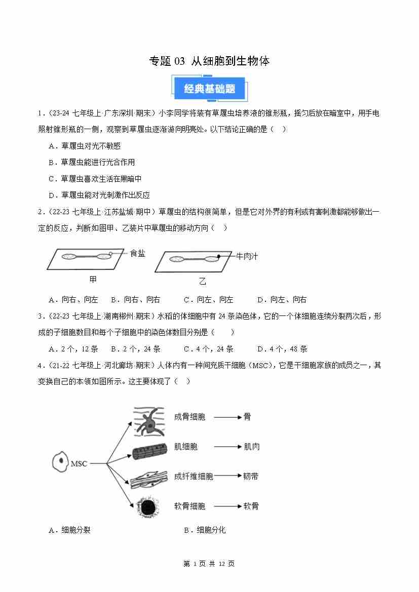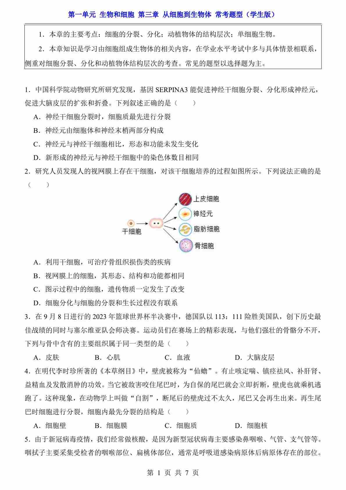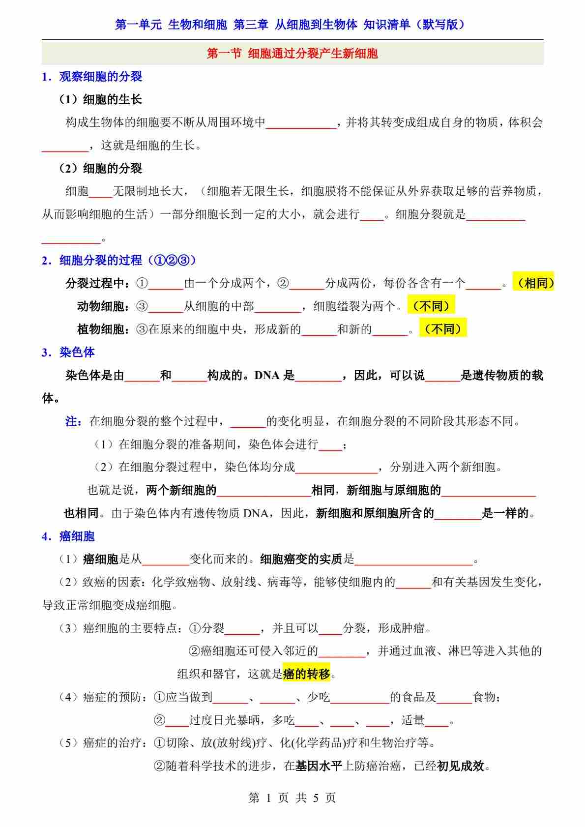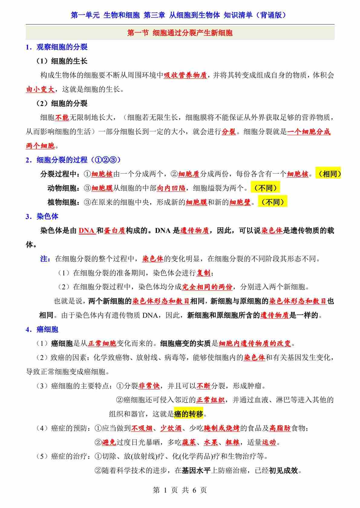 第1单元 第3章 从细胞到生物体(知识清单-背诵版)