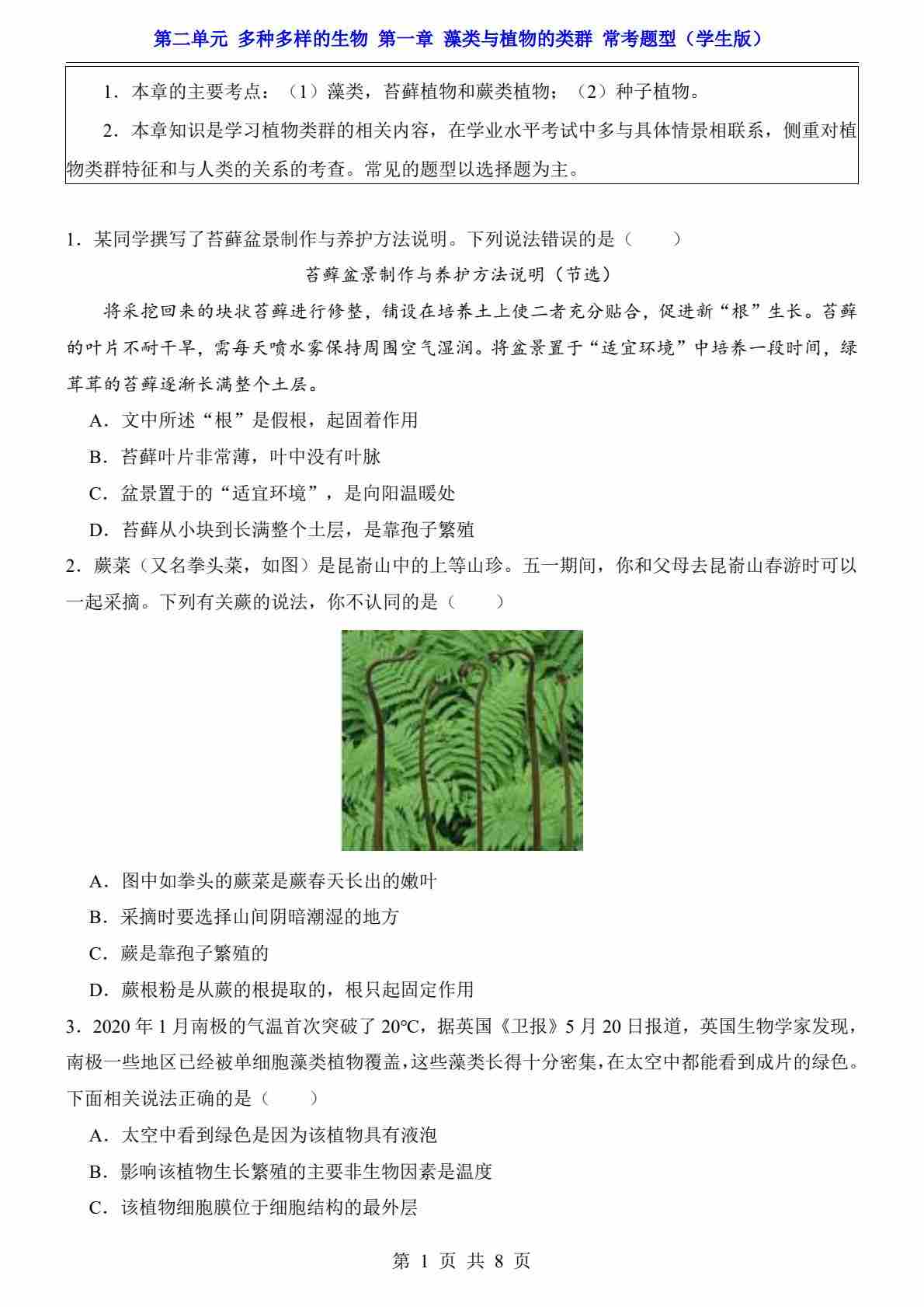 第2单元 第1章 藻类与植物的类群(常考题型)