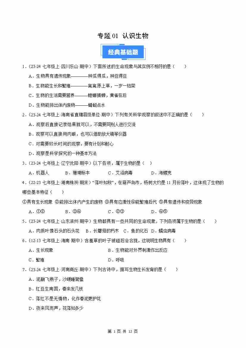 专题01 认识生物(原卷版)