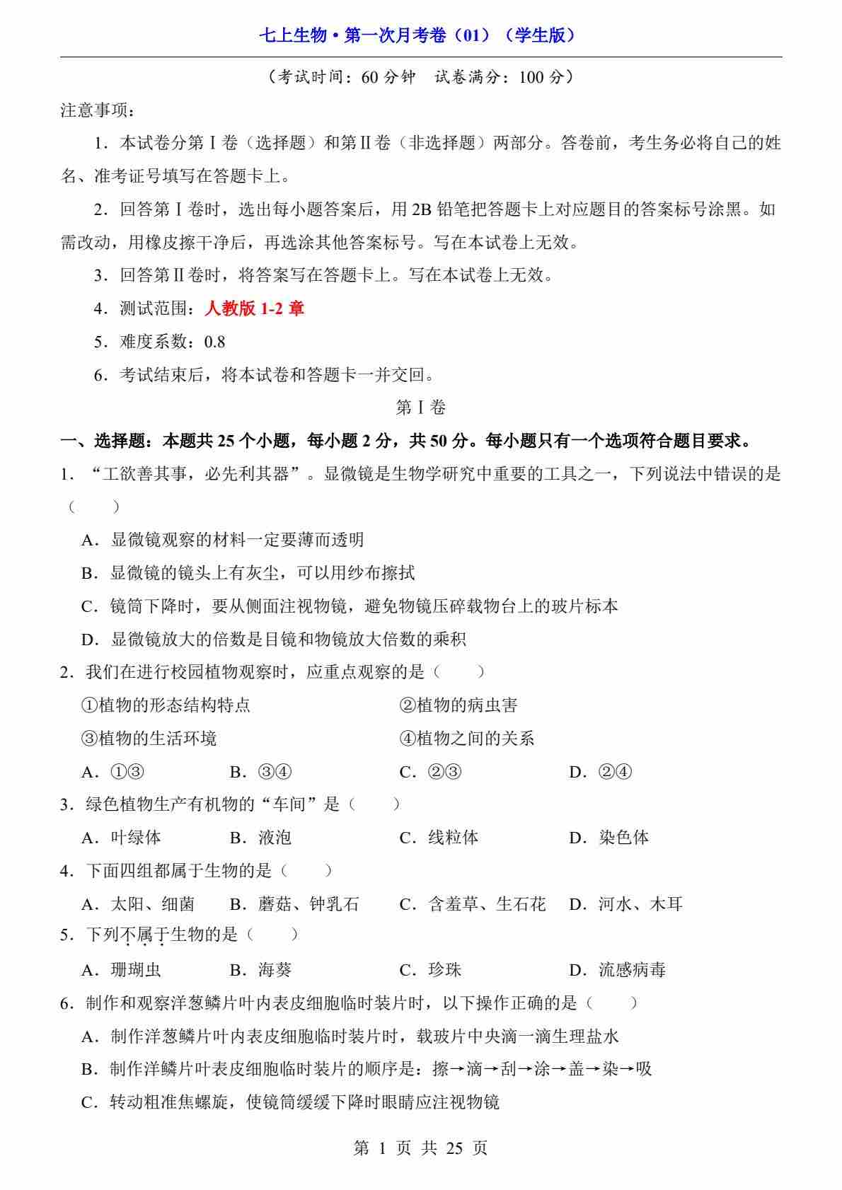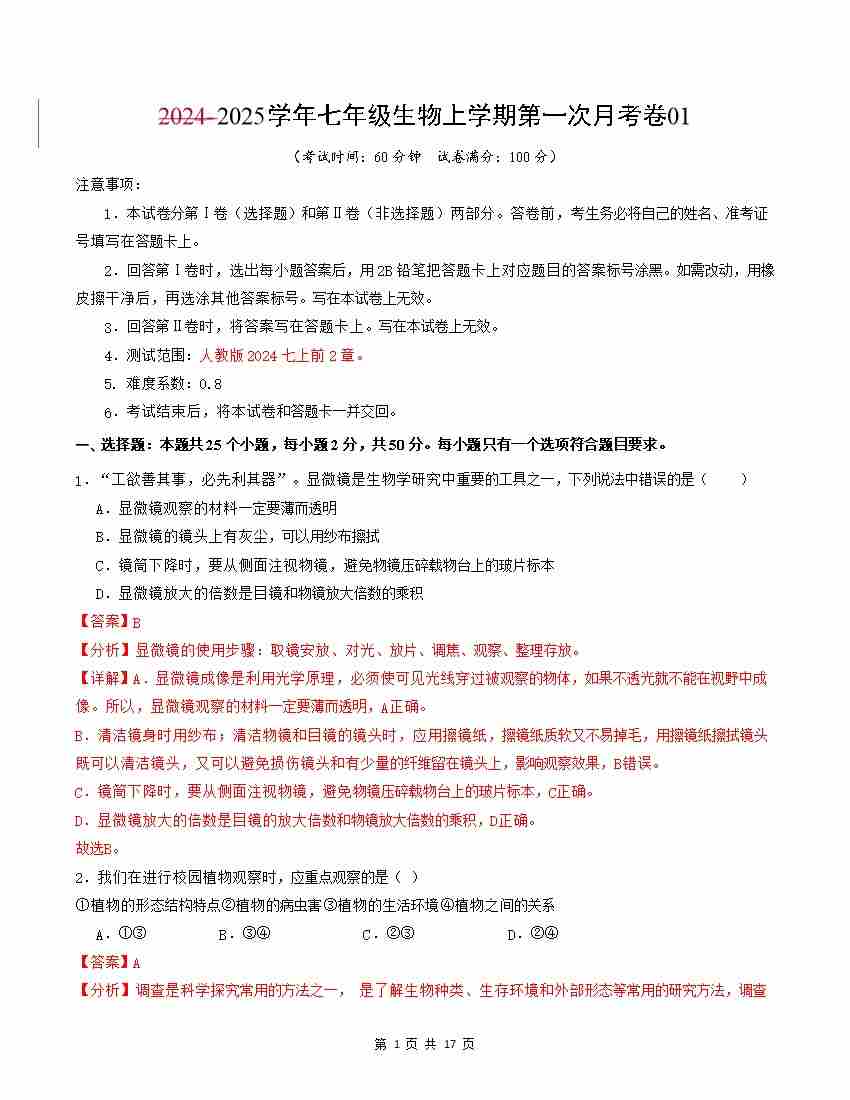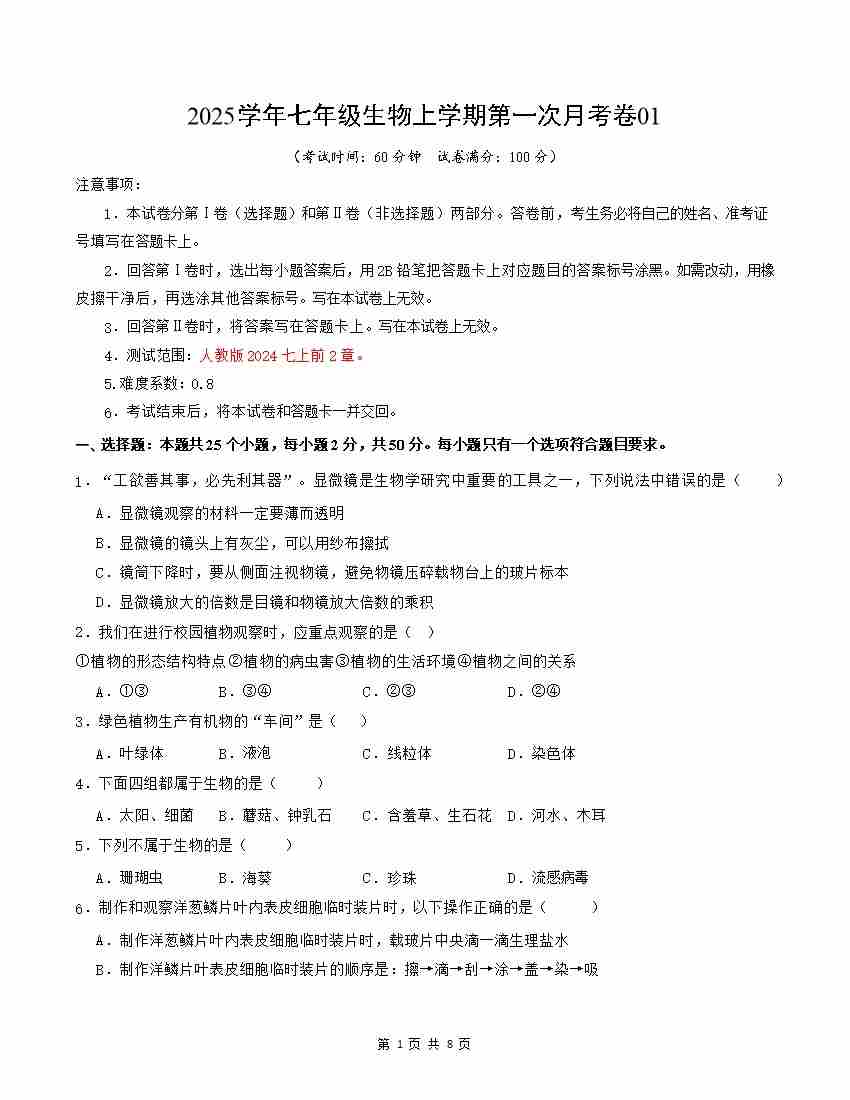 七年级生物第一次月考卷01(考试版A4)【测试范围:第1-2章】(人教版2024)