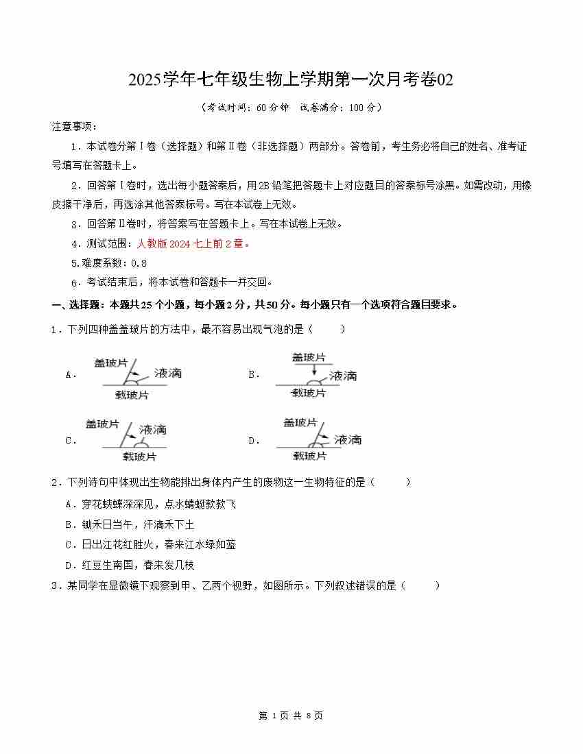 七年级生物第一次月考卷02(A4考试版)【测试范围:第1-2章】(人教版2024)