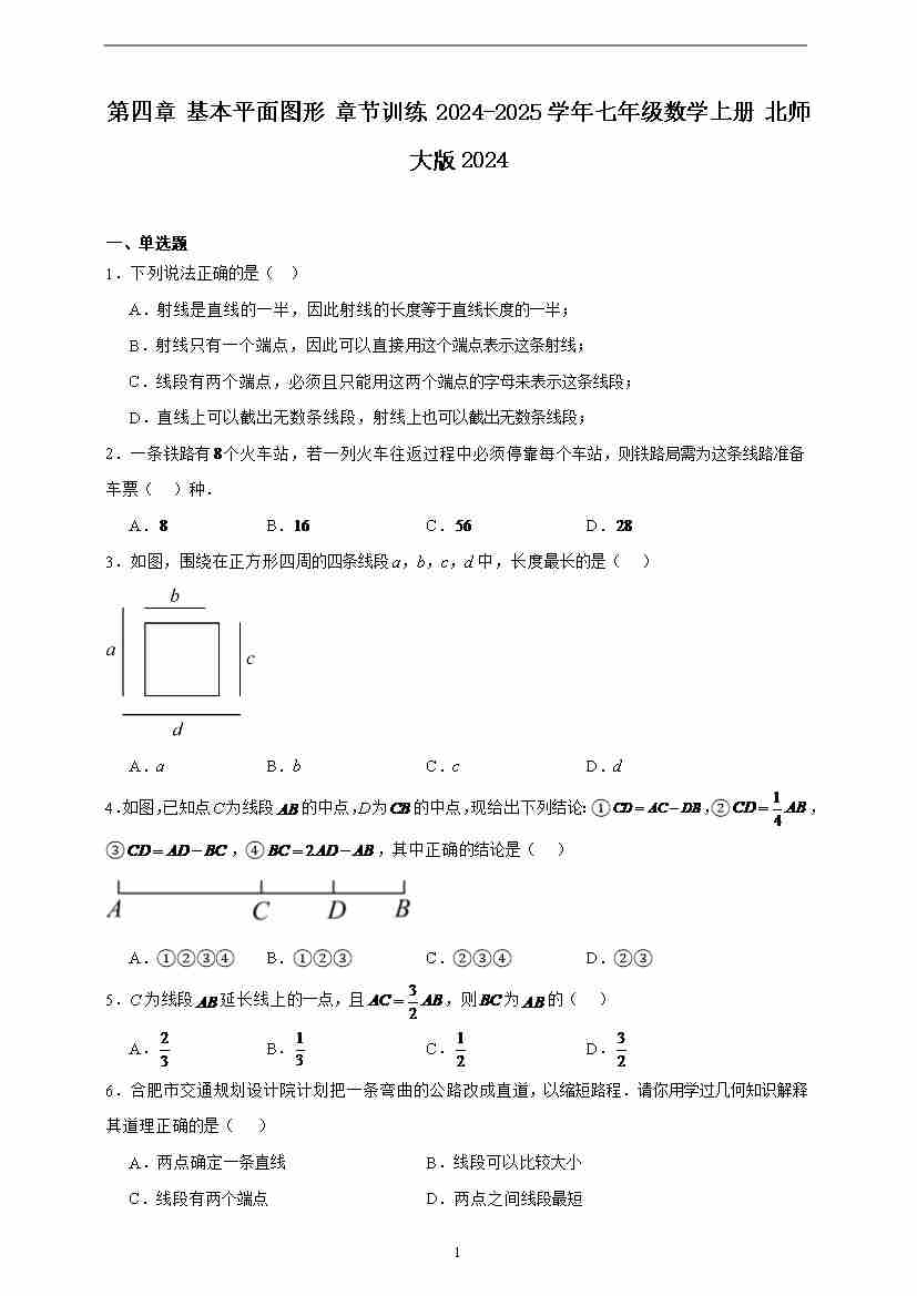 第4章 基本平面图形 章节训练(含答案)2024-2025学年七年级数学上册 北师大版2024