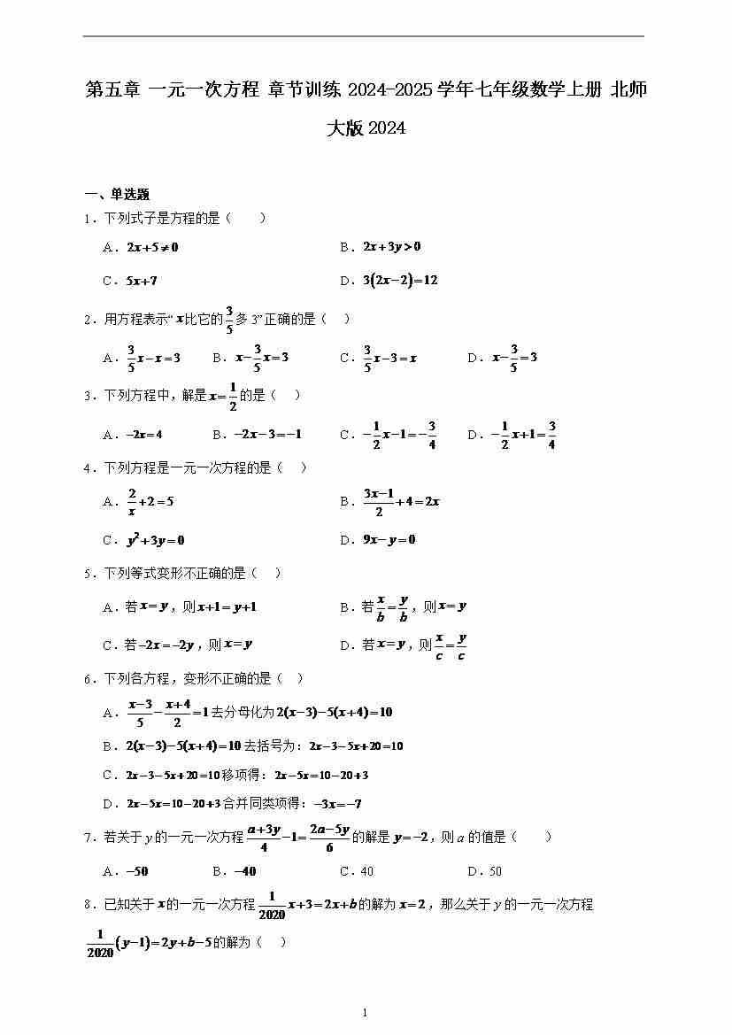 第5章 一元一次方程 章节训练(含答案) 2024-2025学年七年级数学上册 北师大版2024