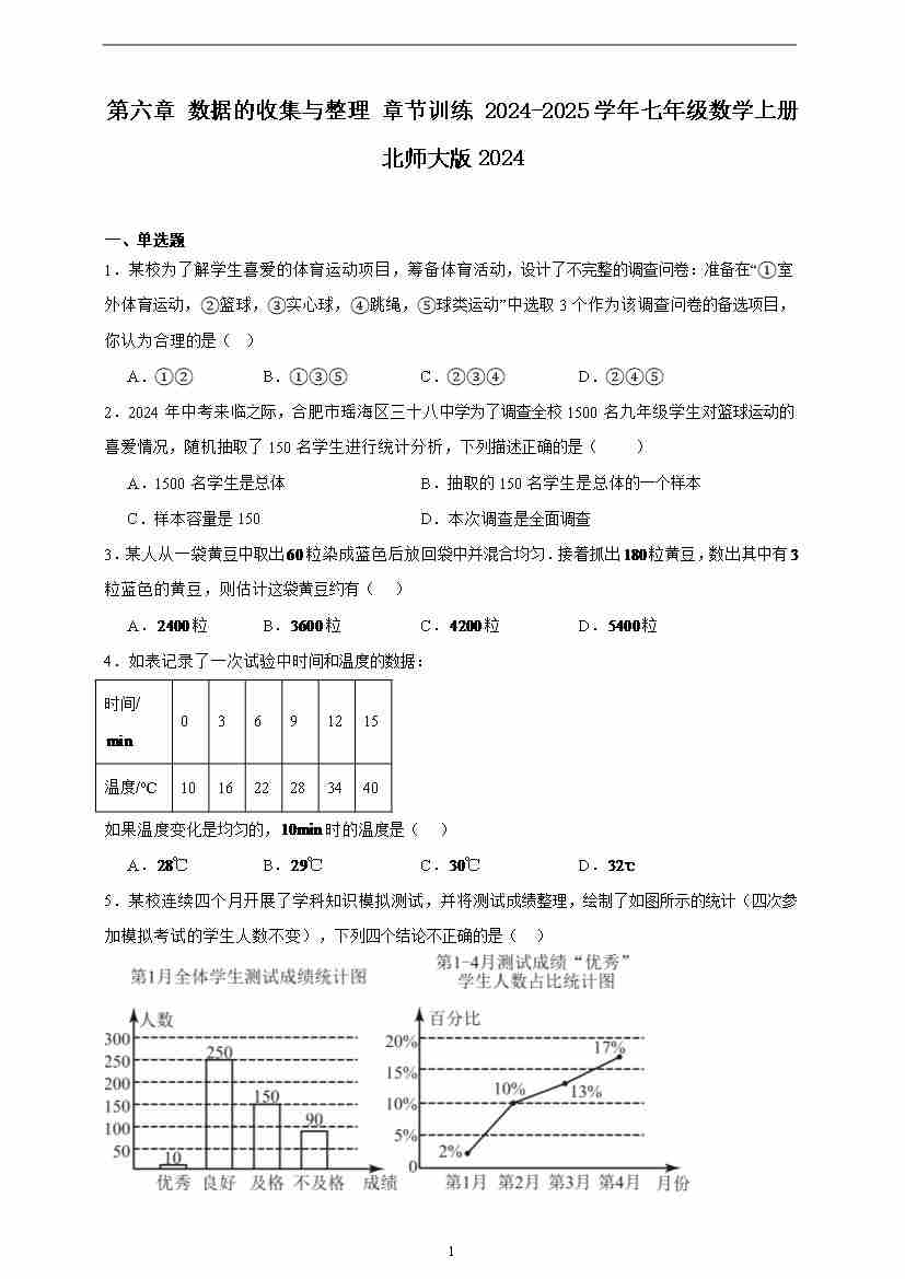 第6章 数据的收集与整理 章节训练(含答案) 2024-2025学年七年级数学上册 北师大版2024