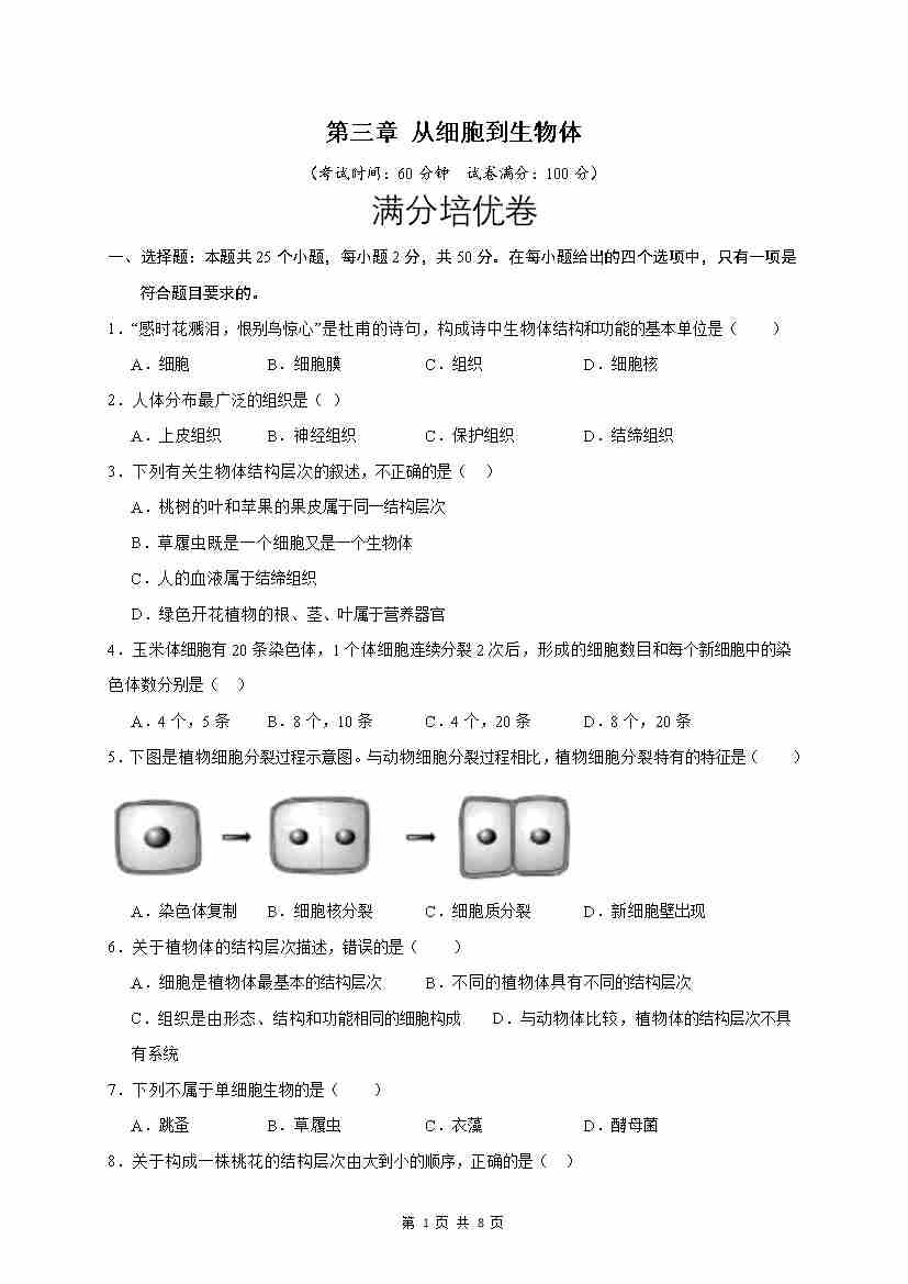 第3章 从细胞到生物体(满分培优卷)(原卷版)