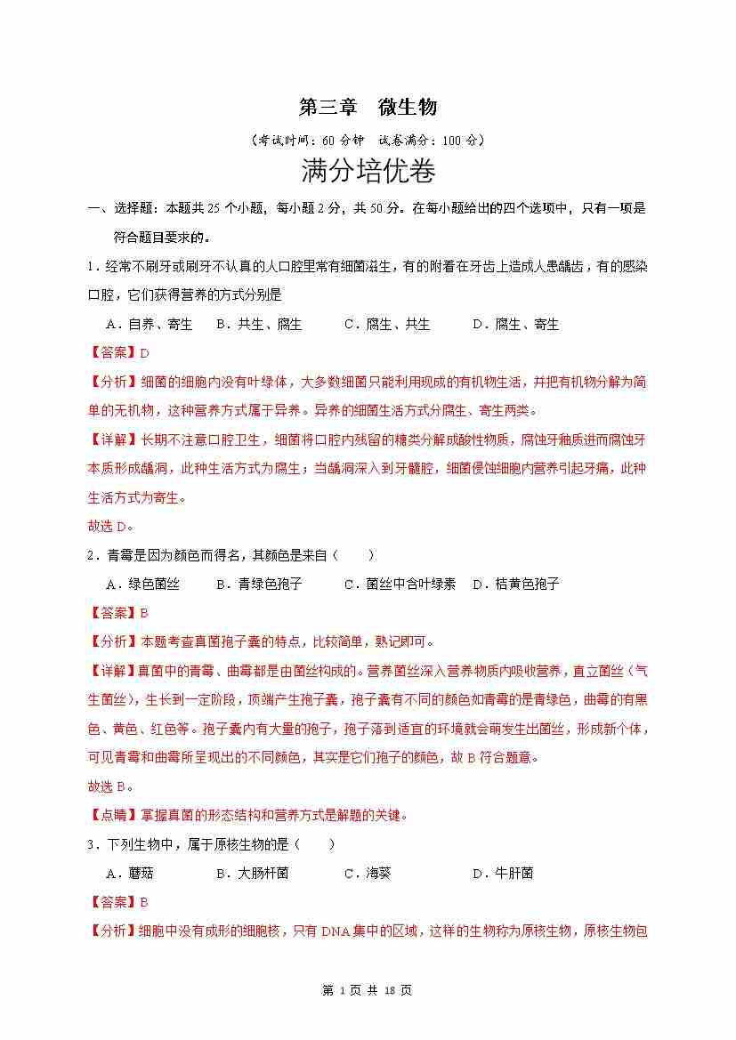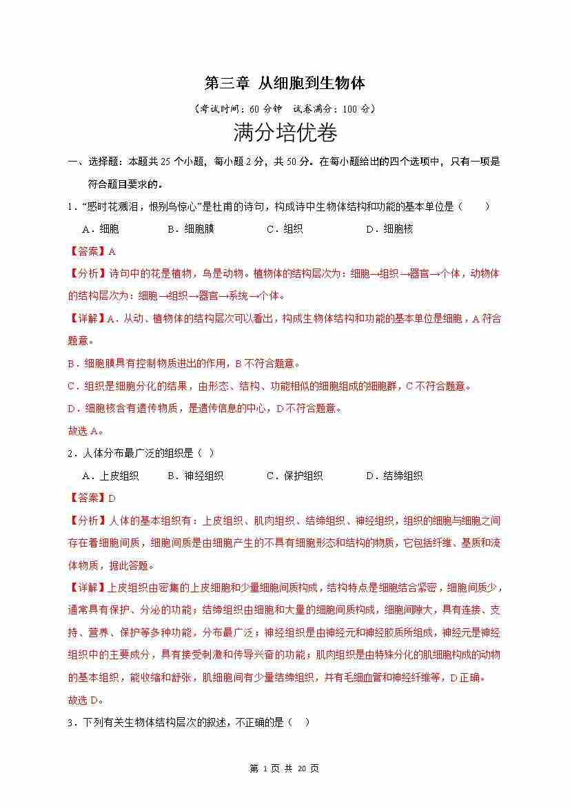 第3章 从细胞到生物体(满分培优卷)(解析版)