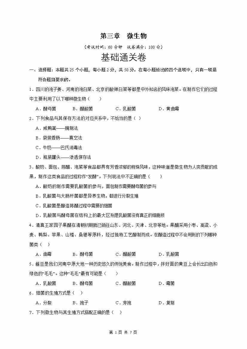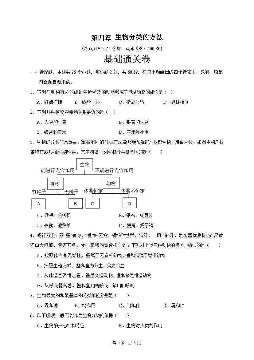 第4章 生物分类的方法(基础通关卷)(原卷版)
