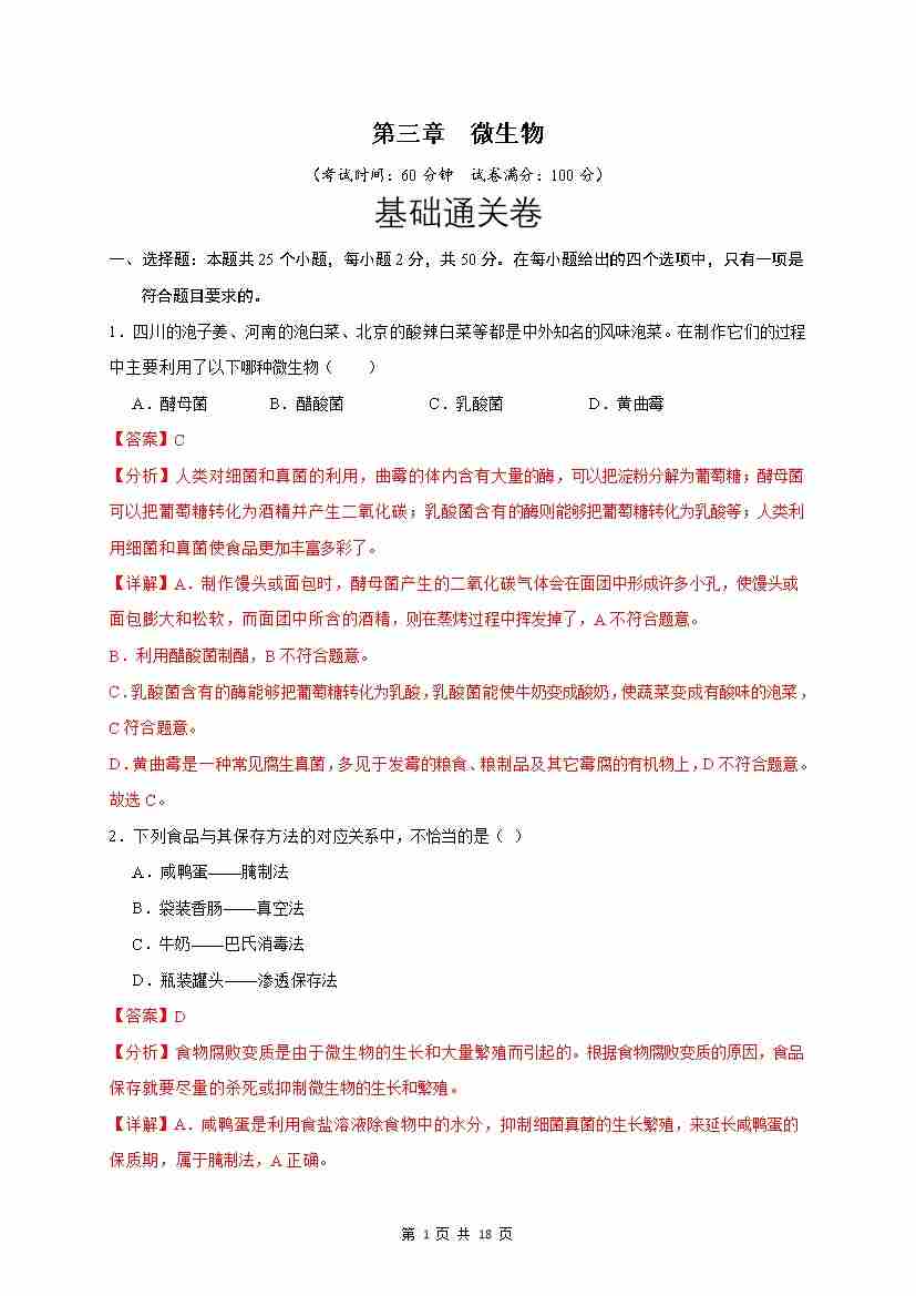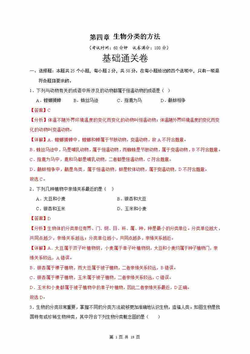 第4章 生物分类的方法(基础通关卷)(解析版)