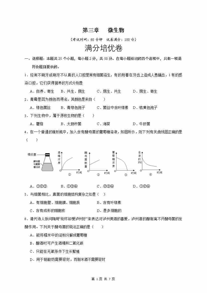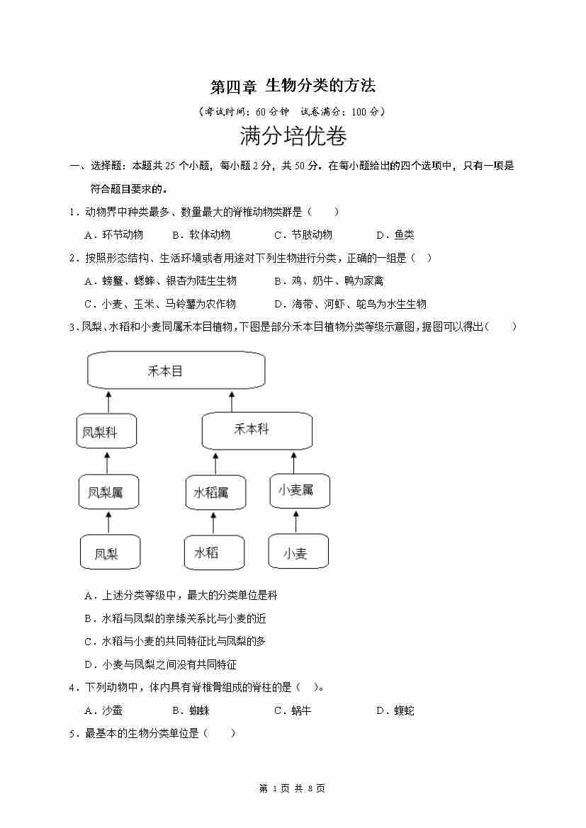第4章 生物分类的方法(满分培优卷)(原卷版)