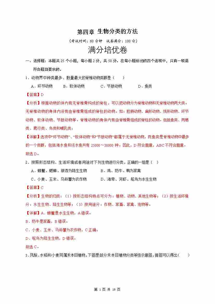 第4章 生物分类的方法(满分培优卷)(解析版)