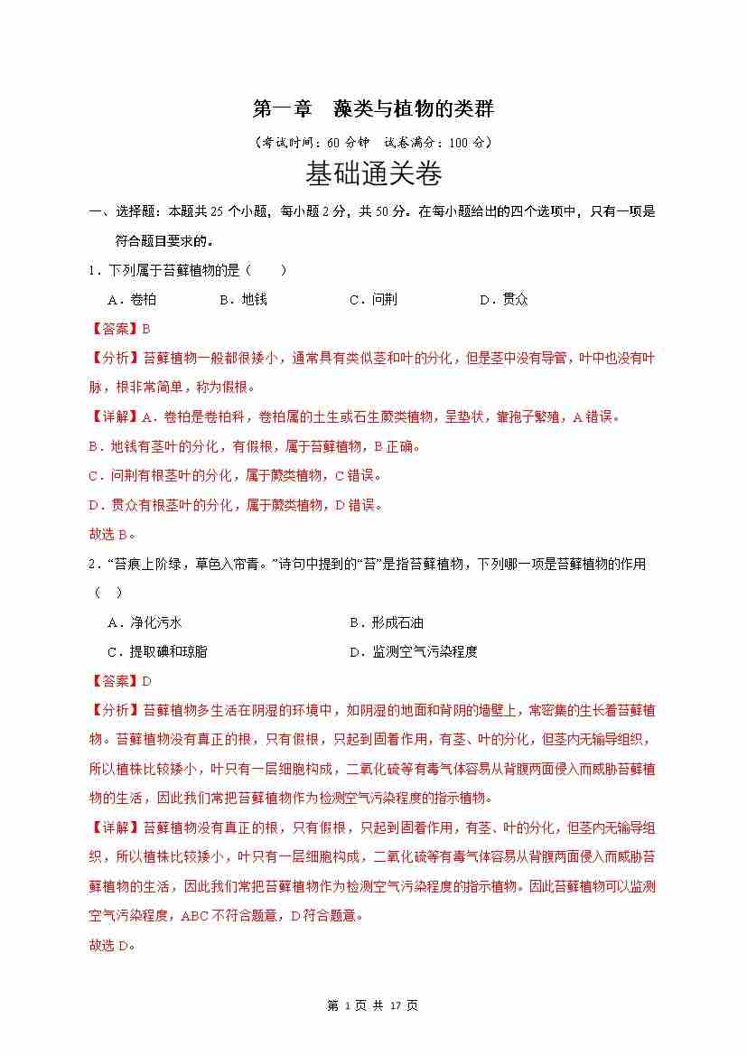 第1章 藻类与植物的类群(基础通关卷)(解析版)