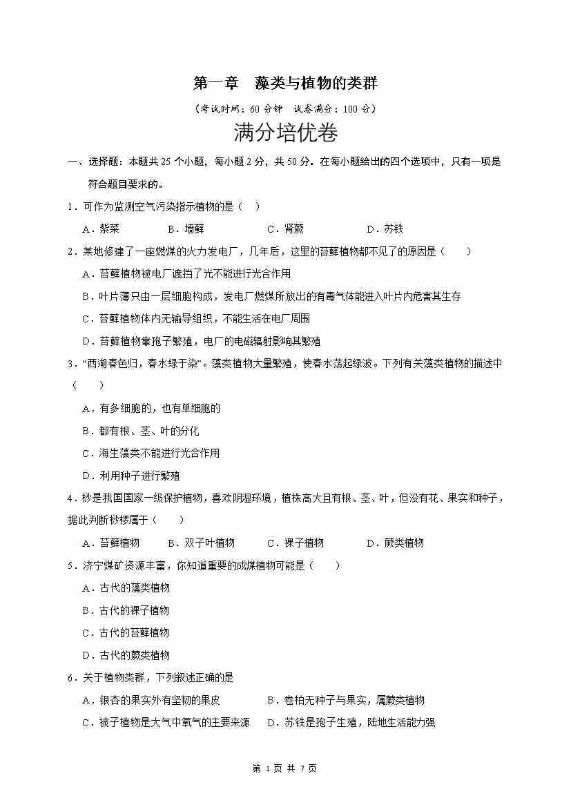 第1章 藻类与植物的类群(满分培优卷)(原卷版)